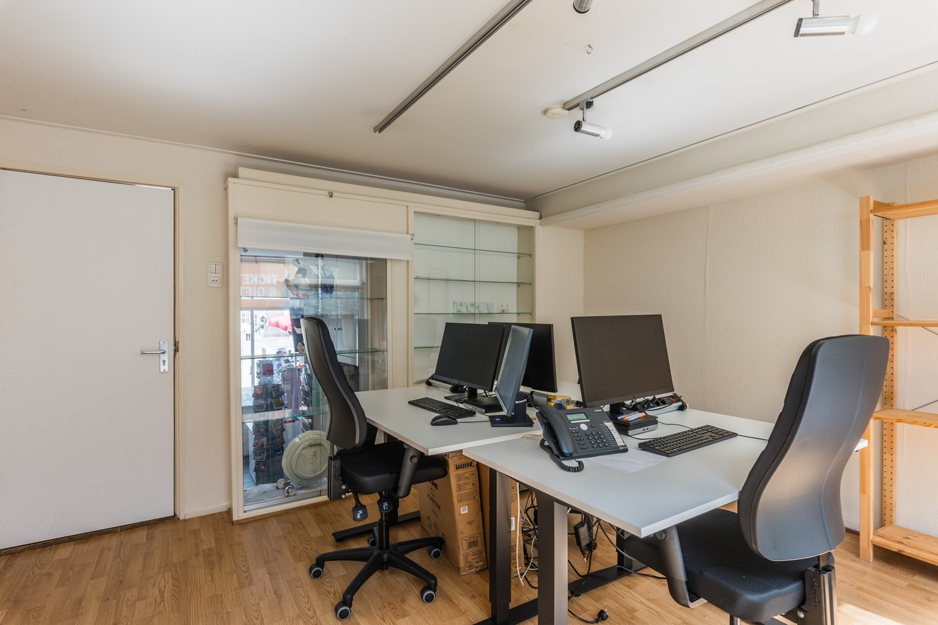 Entree via voordeur, naar open winkelruimte, pantry en toilet, trapopgang naar tussenverdieping met winkel-/kantoorruimte en trap van enkele treden omlaag naar verdiepte begane grond met winkelruimte.