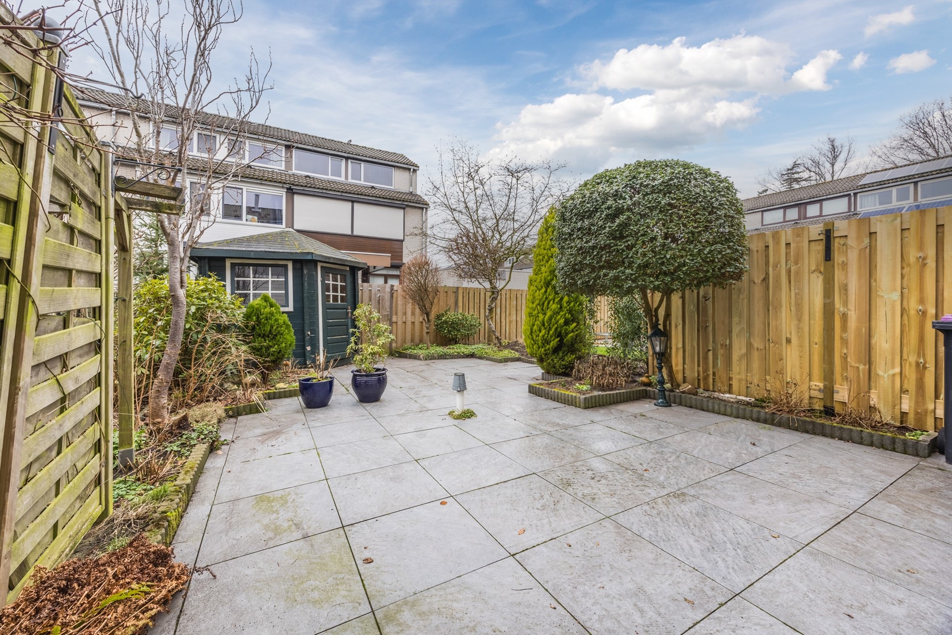 De achtertuin is zonnig op het westen gelegen en voorzien van terras, groenborders, kraantje, achterom, houten berging en elektrisch zonnescherm.