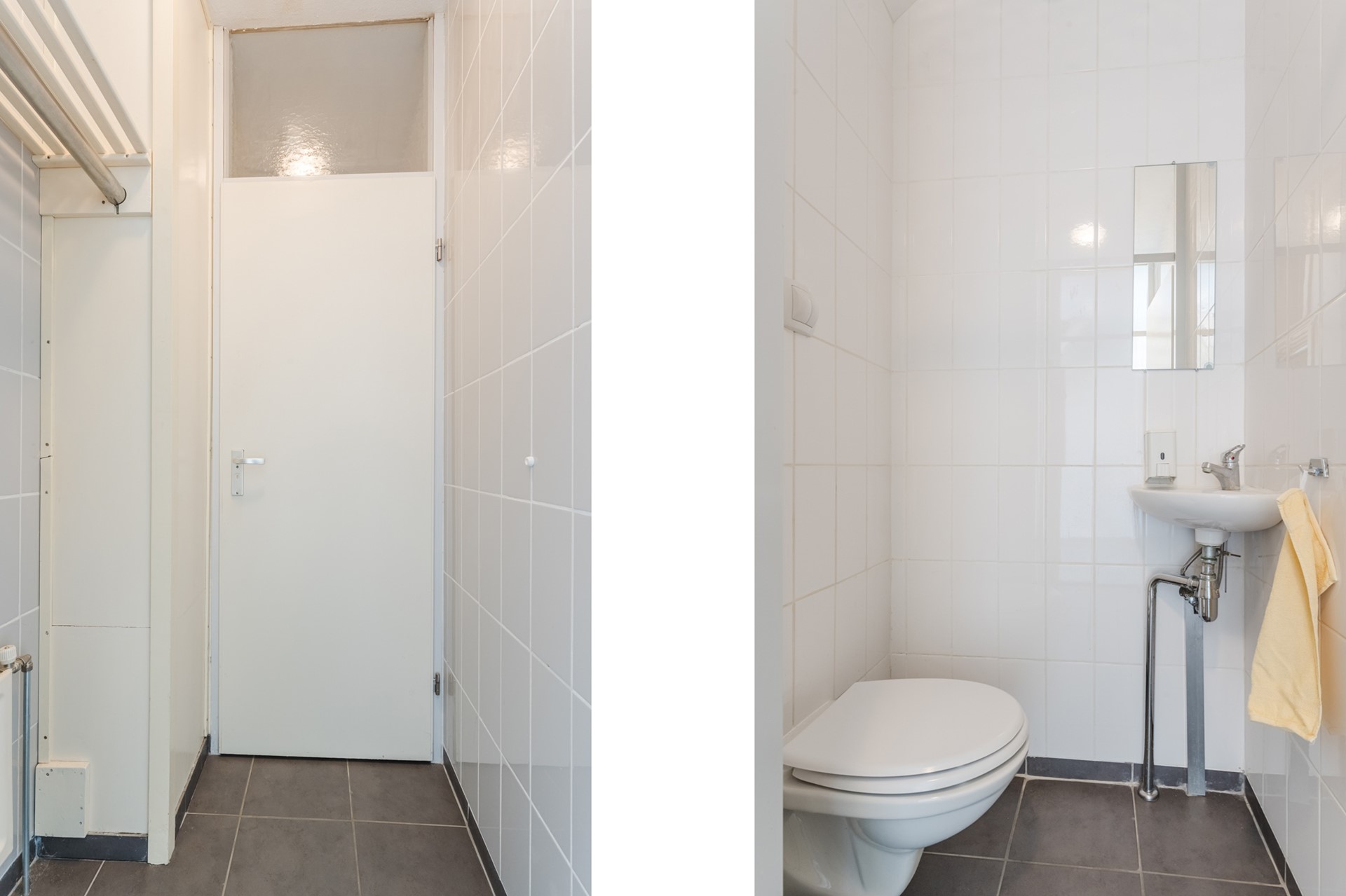 • De toiletruimte op de begane grond is netjes, geheel betegeld en voorzien van een hangend toilet en een fonteintje.