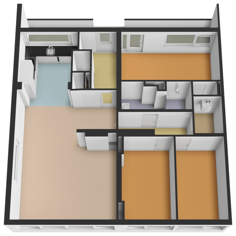 Hal met toilet, slaapkamer, badkamer, wasruimte, 2 slaapkamers aan de achterzijde en woonkamer met open keuken.