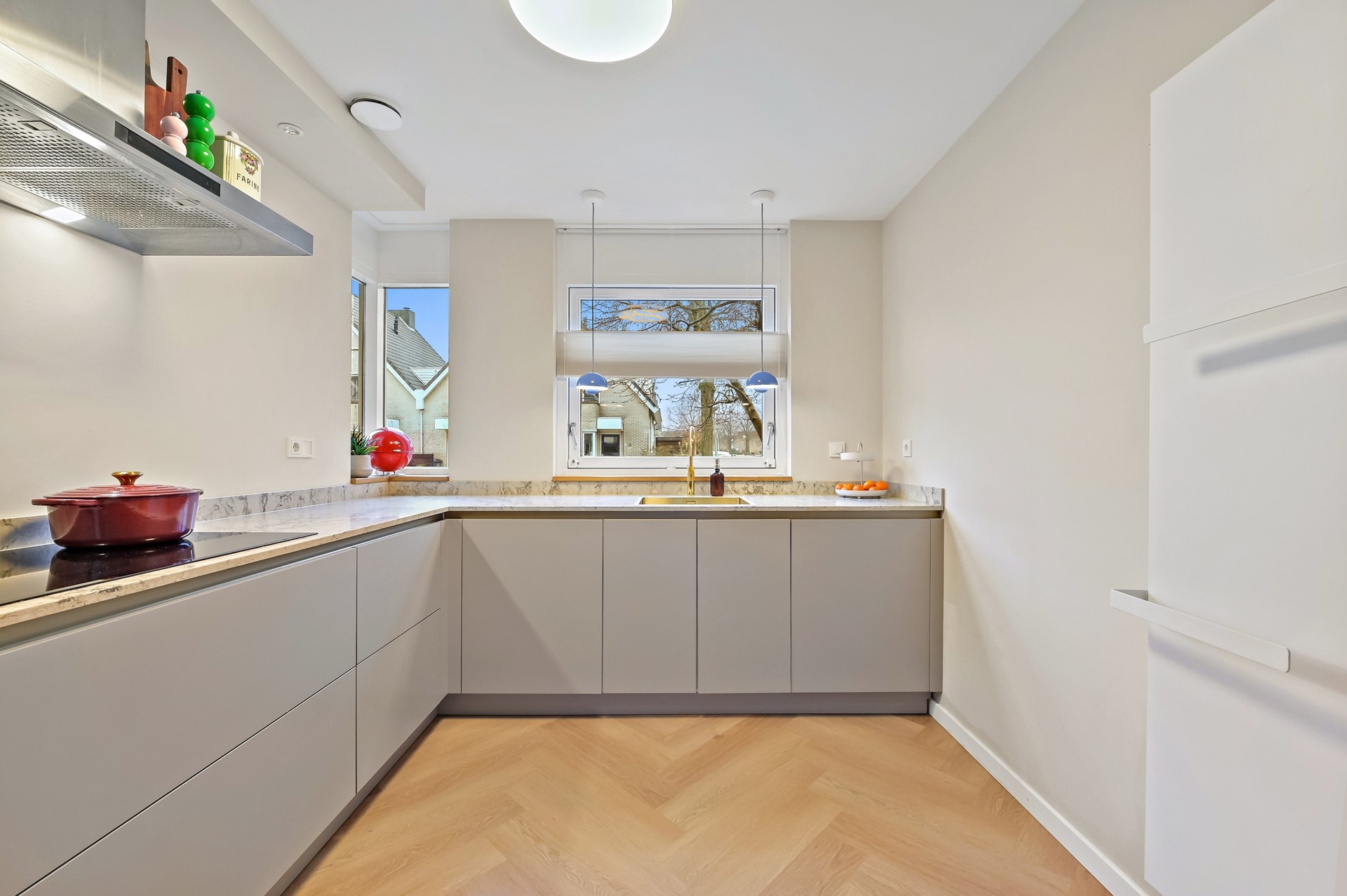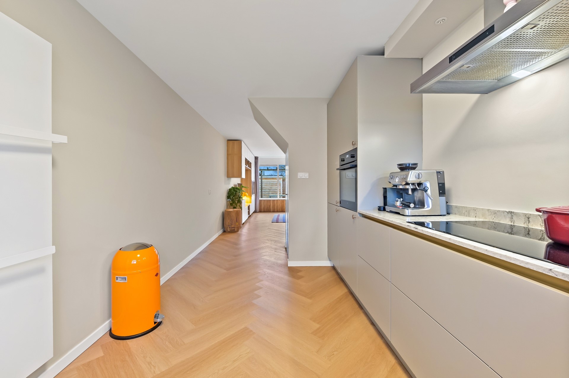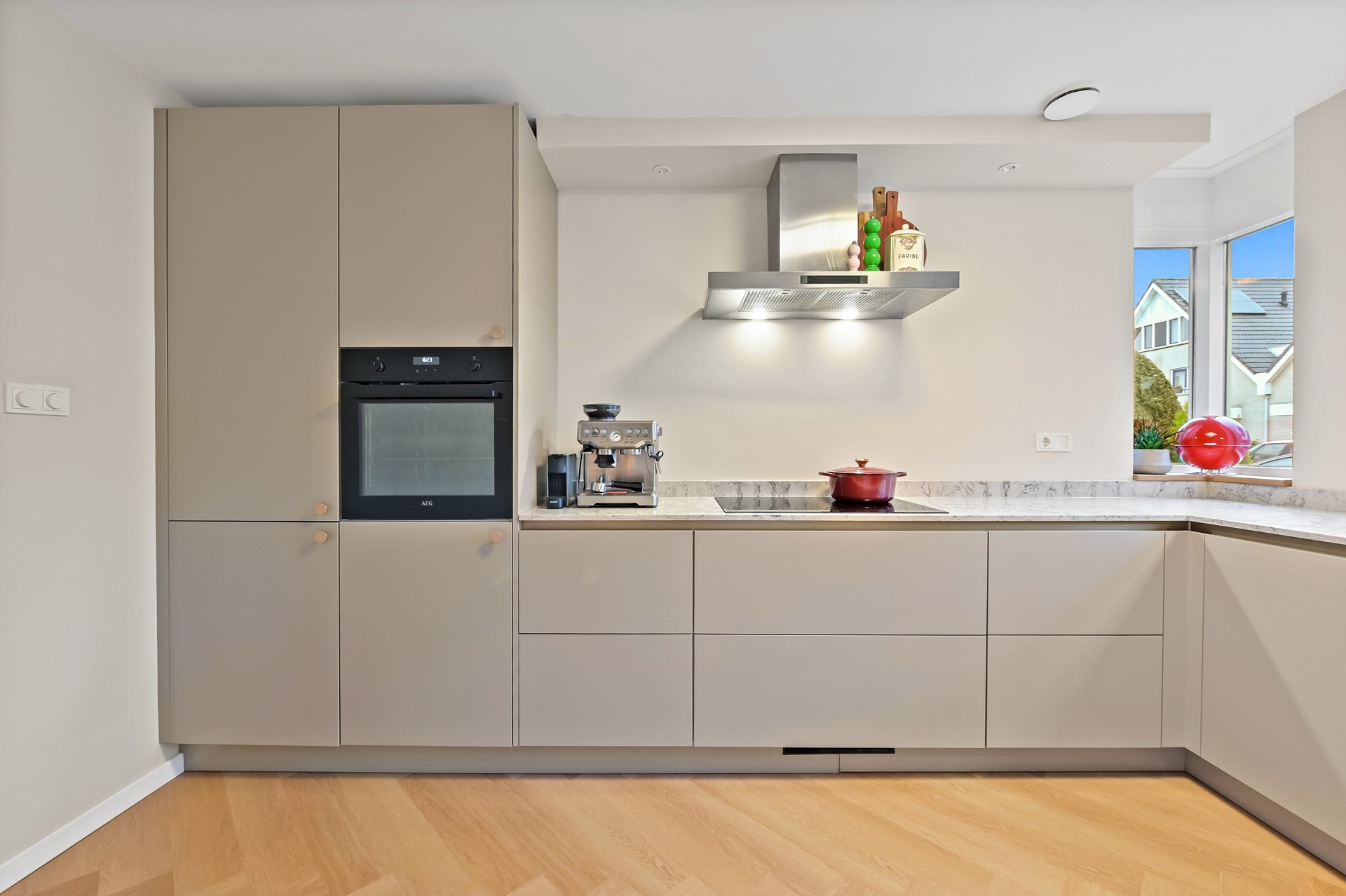 • Luxe keuken voorzien van 4 pits inductiekookplaat met afzuigkap, inbouwoven, spoelbak met Quooker, koelkast, vriezer, vaatwasser, composiet werkblad, kwalitatieve AEG inbouwapparatuur en extra bergruimte in de praktische trapkast.