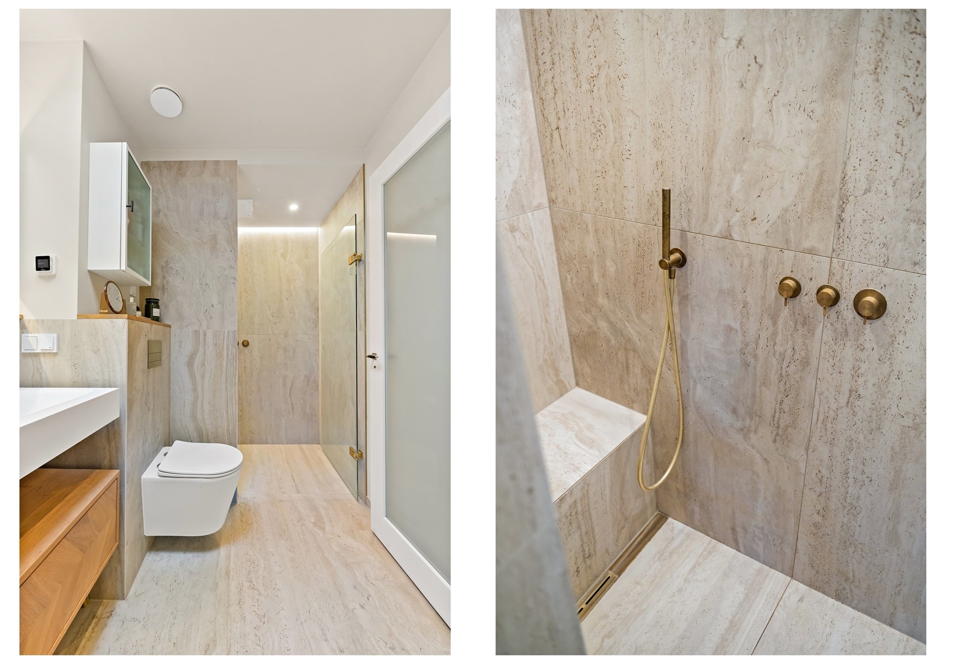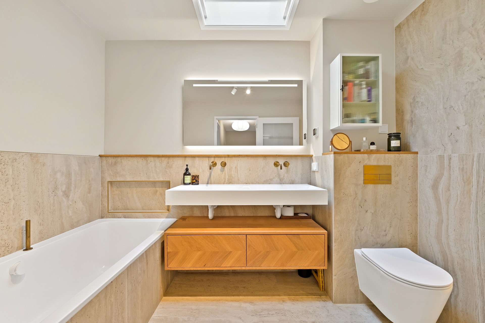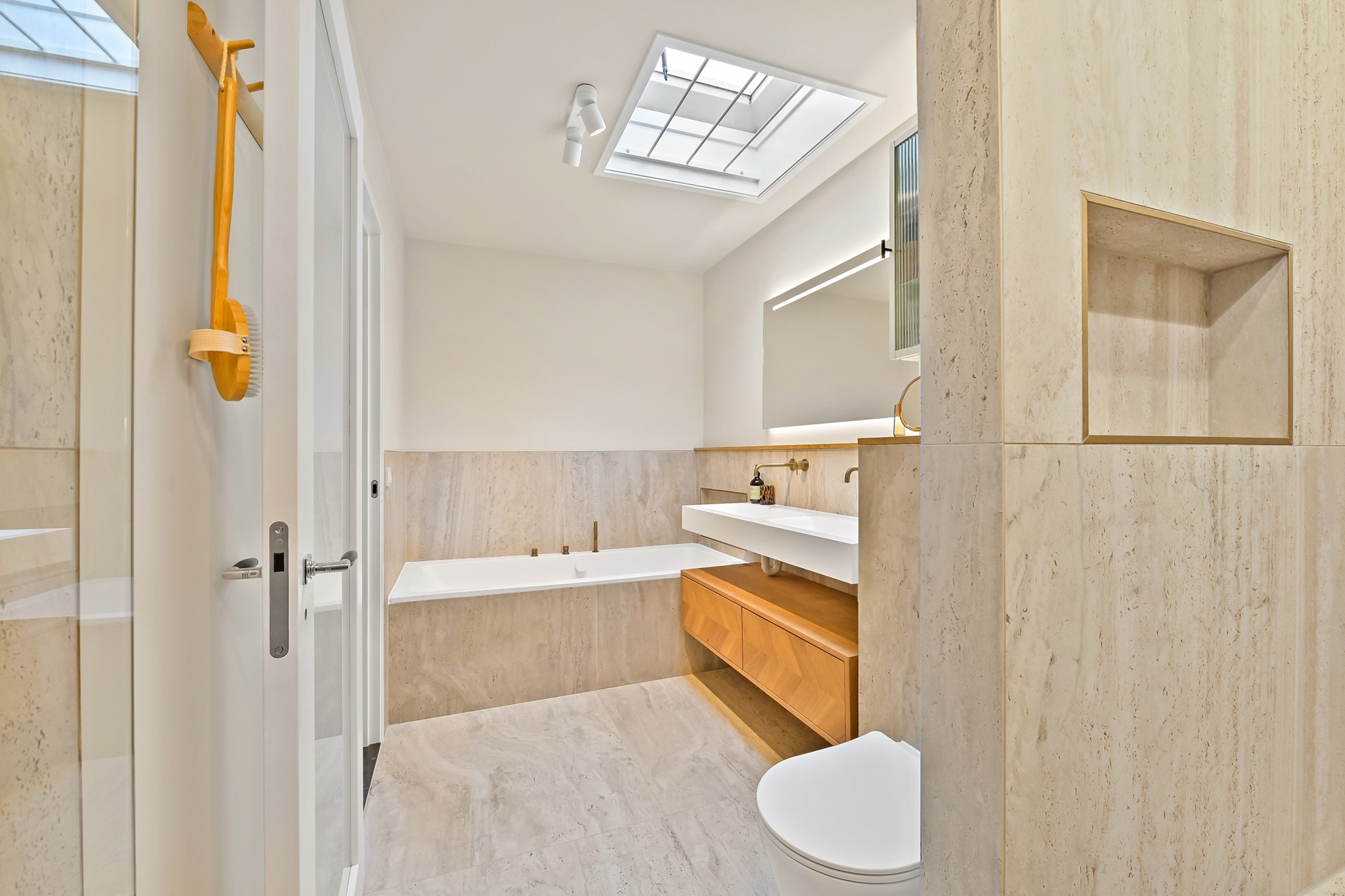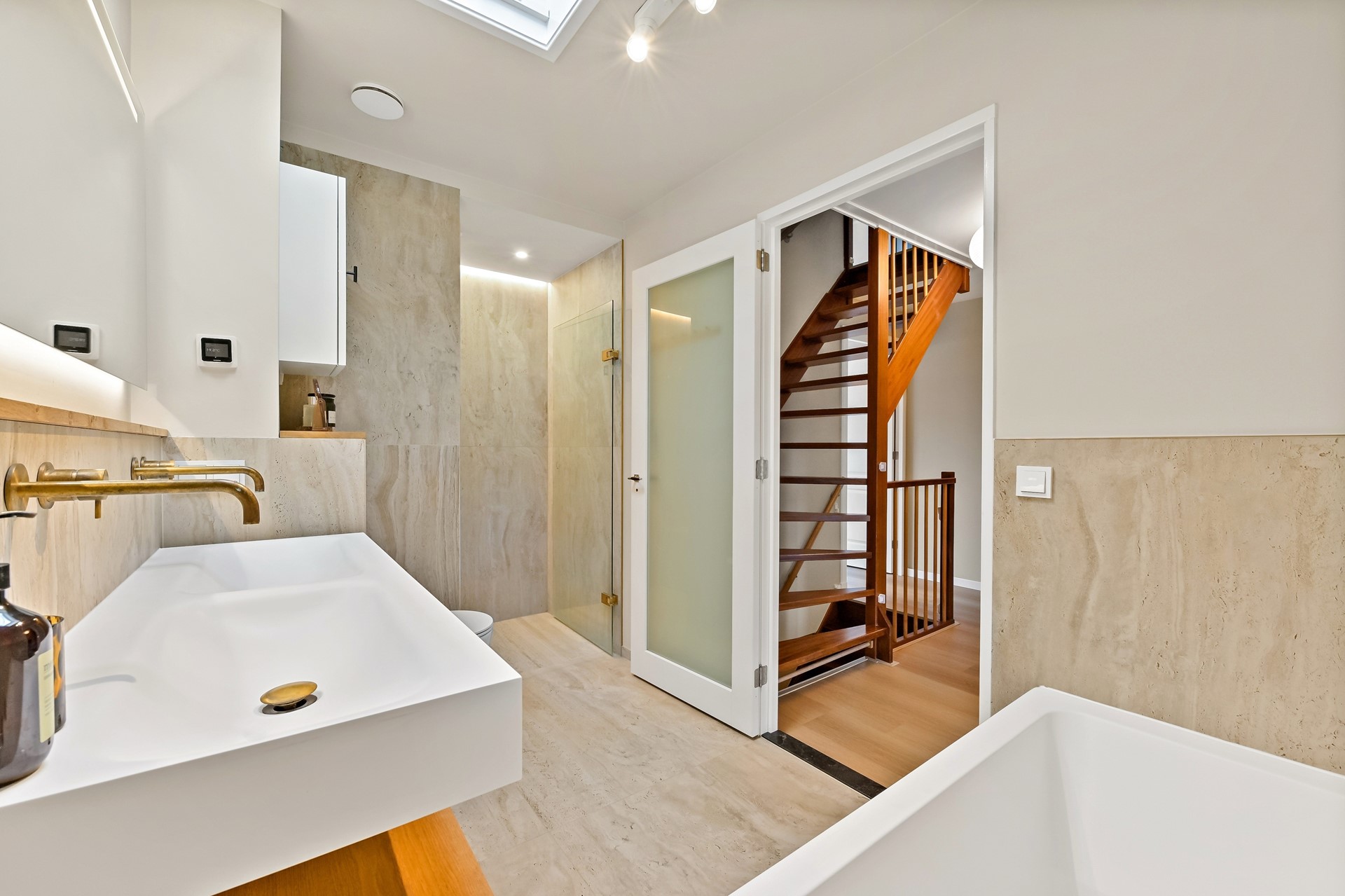 • Luxe badkamer met ligbad, royale inloopdouche met regendouche, nis en zitbankje, 2e toilet met zwevend closet, dubbele wastafel met design meubel (100% eiken), een grote (verlichte) spiegel en elektrische vloerverwarming. Prettig extra lichtinval door het dakraam en sfeervolle indirecte verlichting.