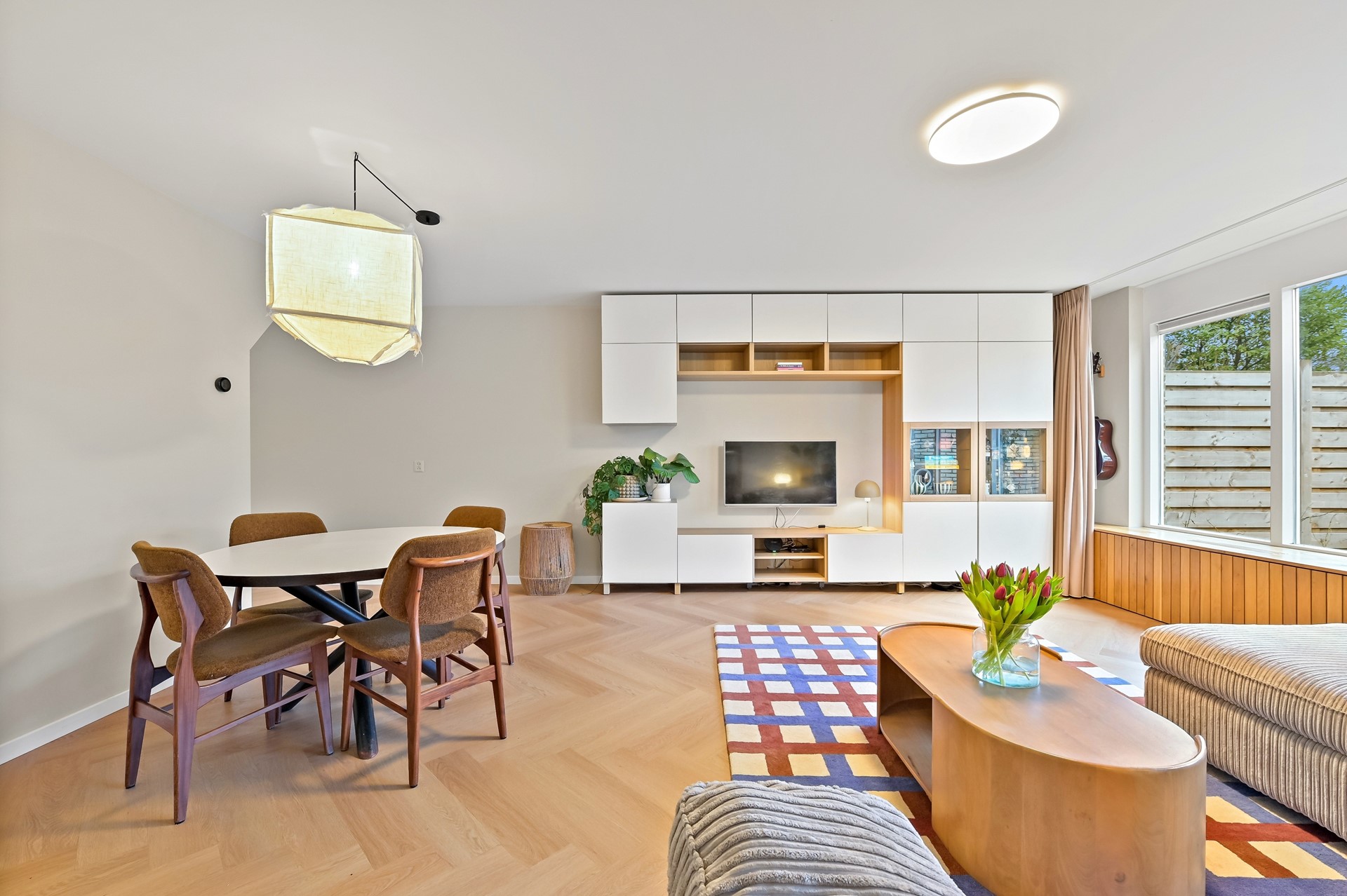 • Ruime woonkamer met mooie PVC vloer met vloerverwarming en deur naar de tuin.