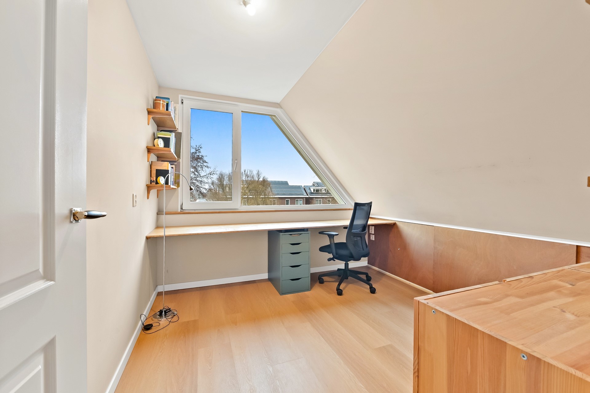 • De 2e verdieping is optimaal ingedeeld met eveneens 2 kamers, waarvan 1 momenteel in gebruik als werkplek met mooi groen uitzicht (eenvoudig als slaapkamer te gebruiken).