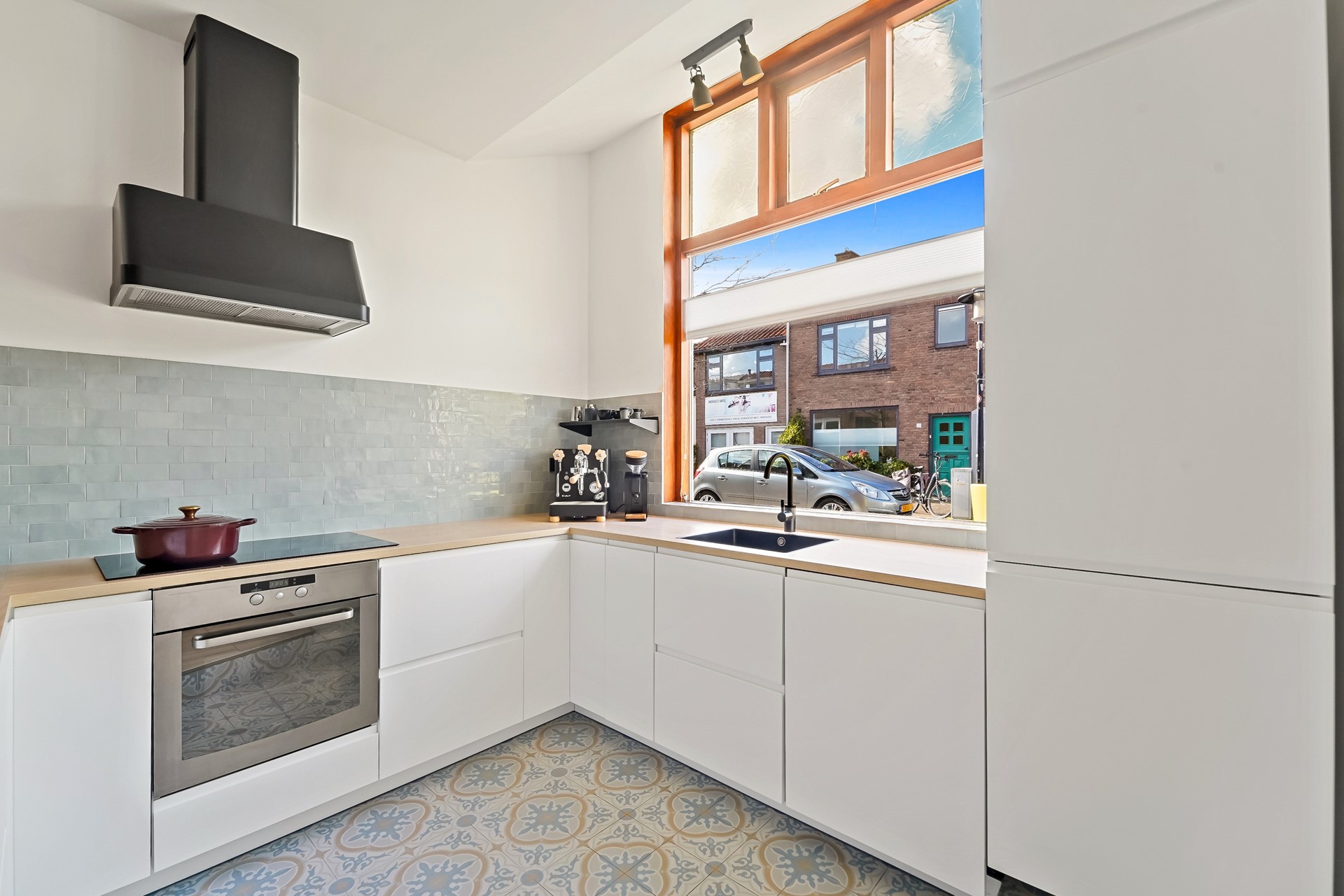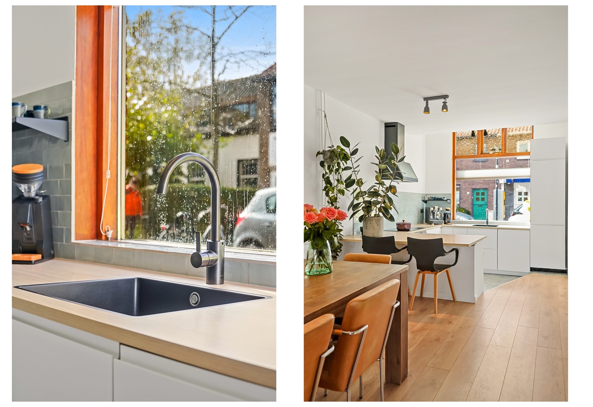 • Moderne open keuken uit 2021 met een leuke tegelvloer. De keuken is voorzien van o.a. een inductie kookplaat met afzuigkap, moderne zwarte spoelbak met mengkraan, vaatwasser, koelkast, vriezer en oven.