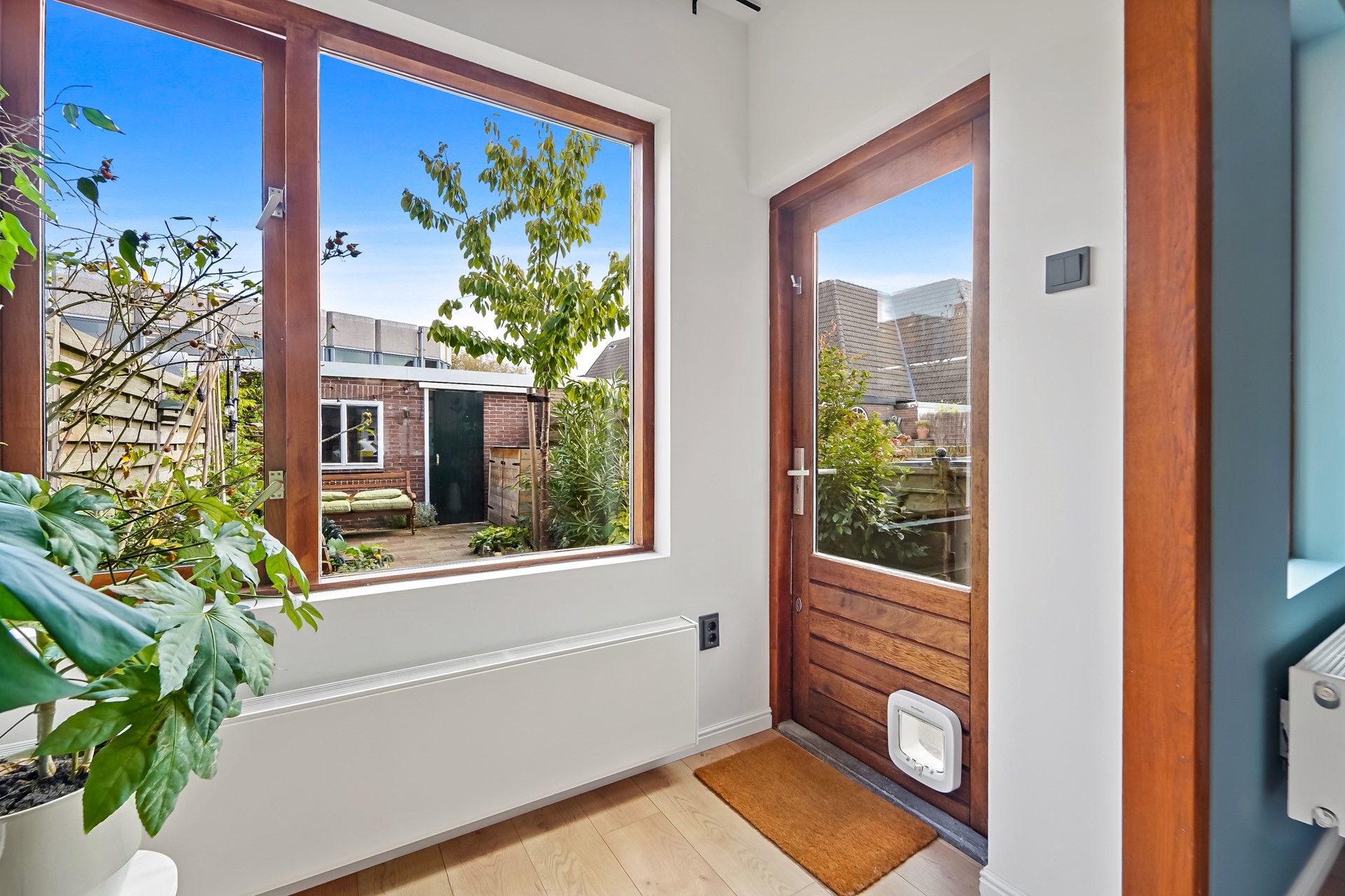 Toegang tot de open keuken, toilet en woonkamer met deur naar de achtertuin.