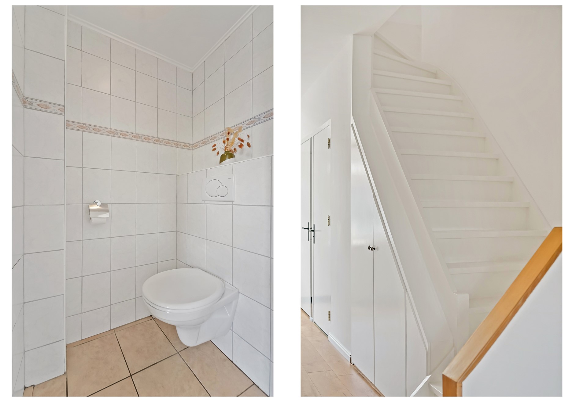 • Trapkast met wasmachine-aansluiting en bergruimte.