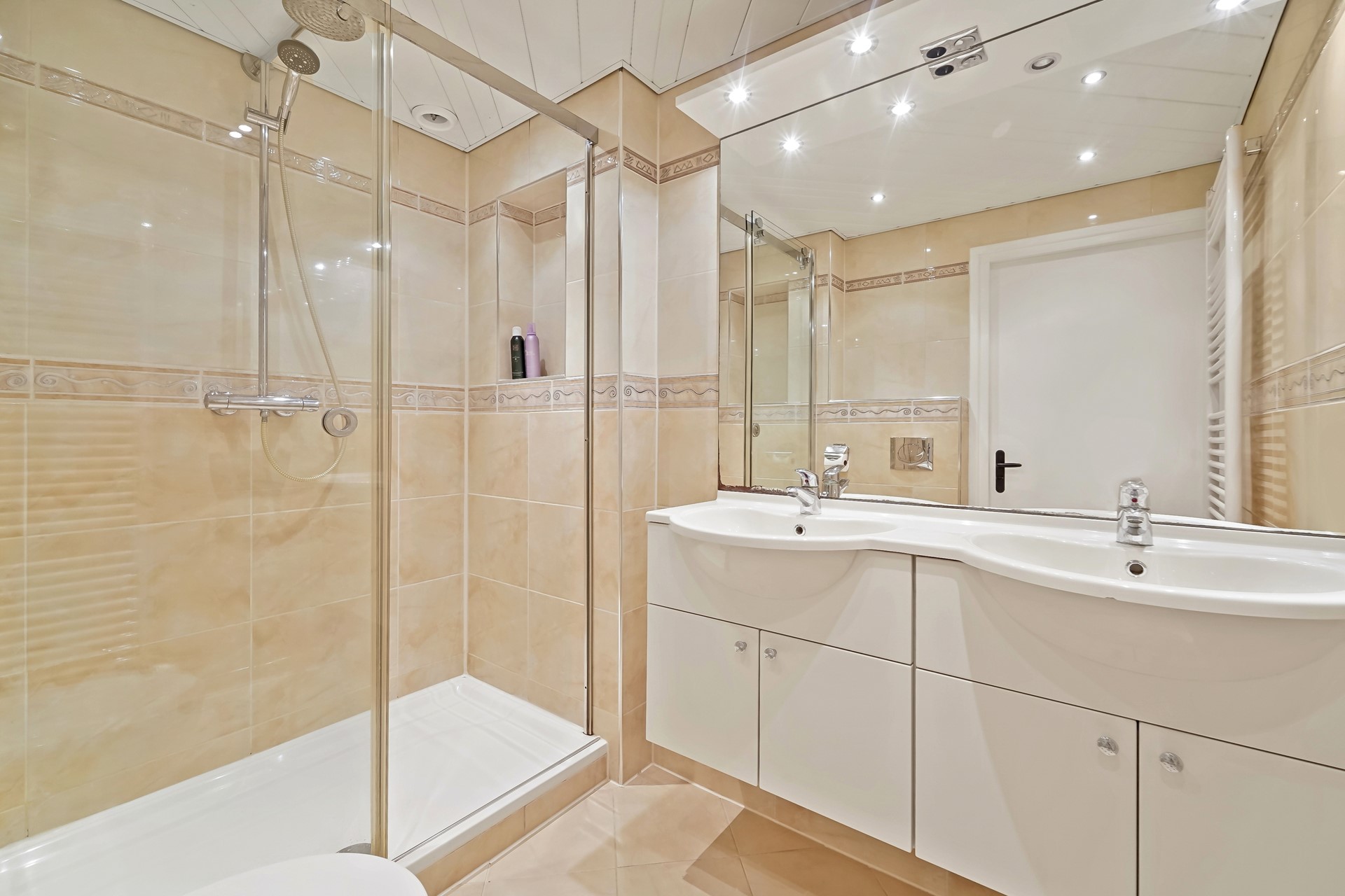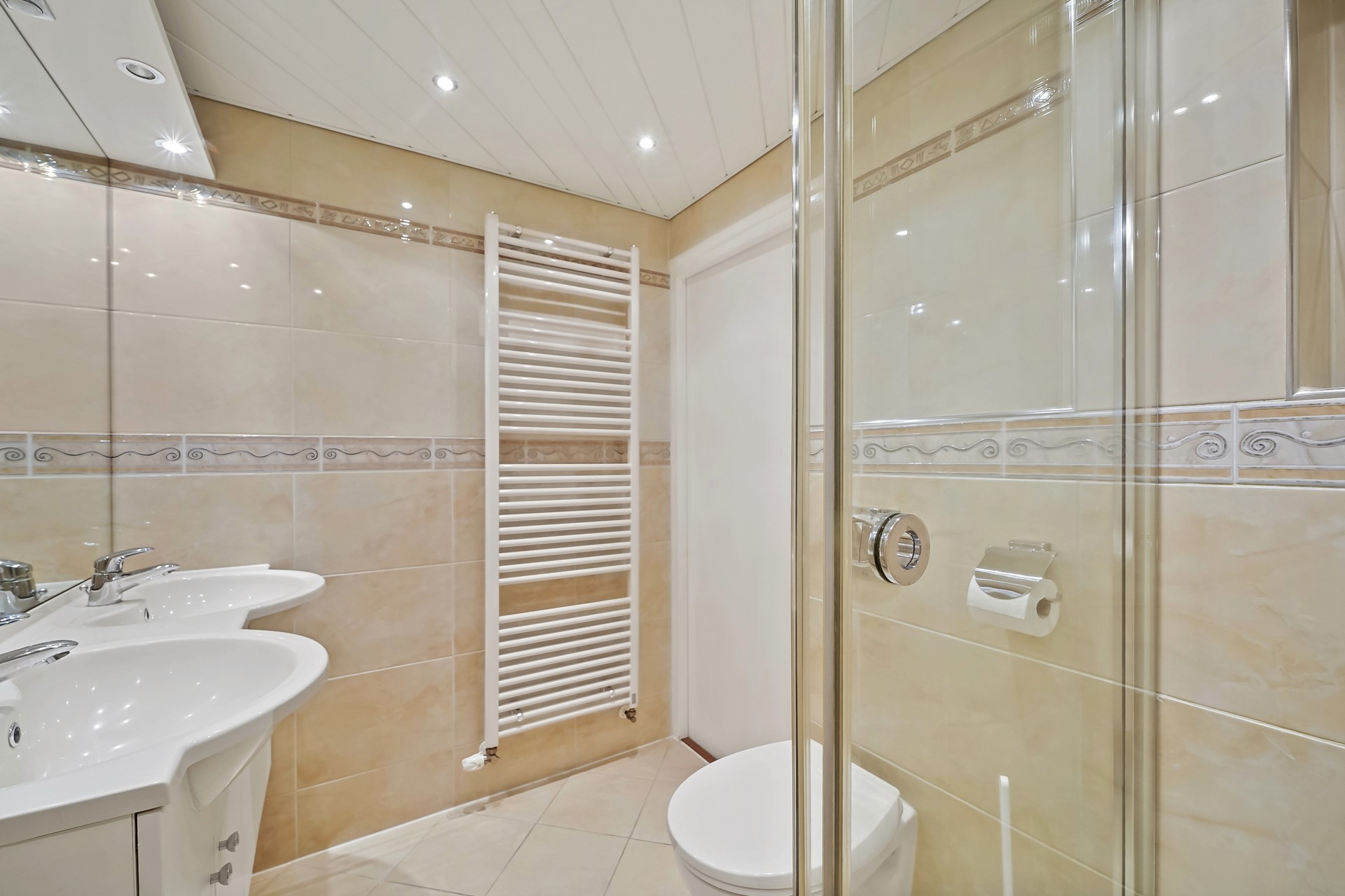 • De badkamer is volledig betegeld, voorzien van een douchehoek, 2e toilet met zwevend closet, dubbele wastafel met meubel en een designradiator.