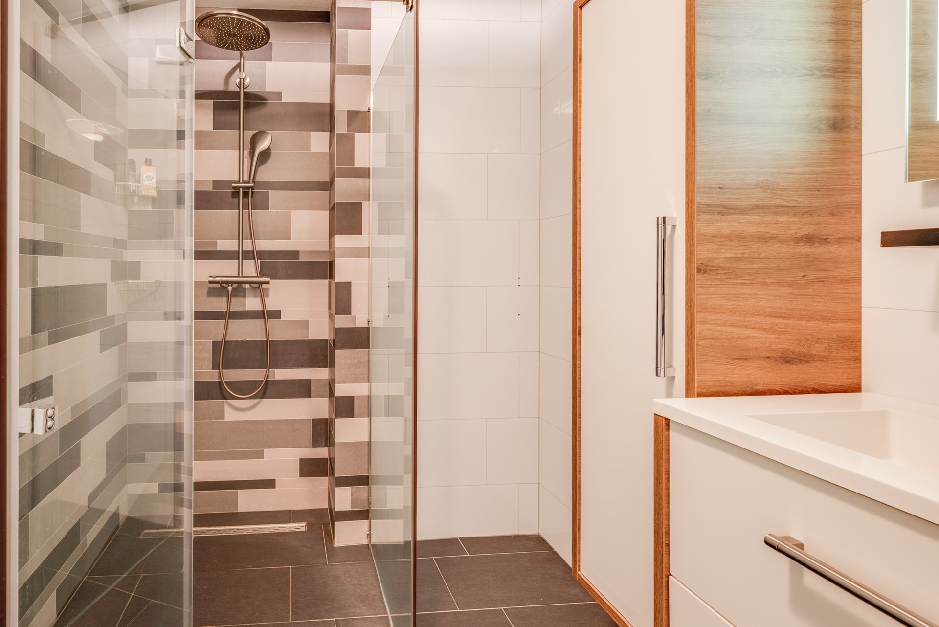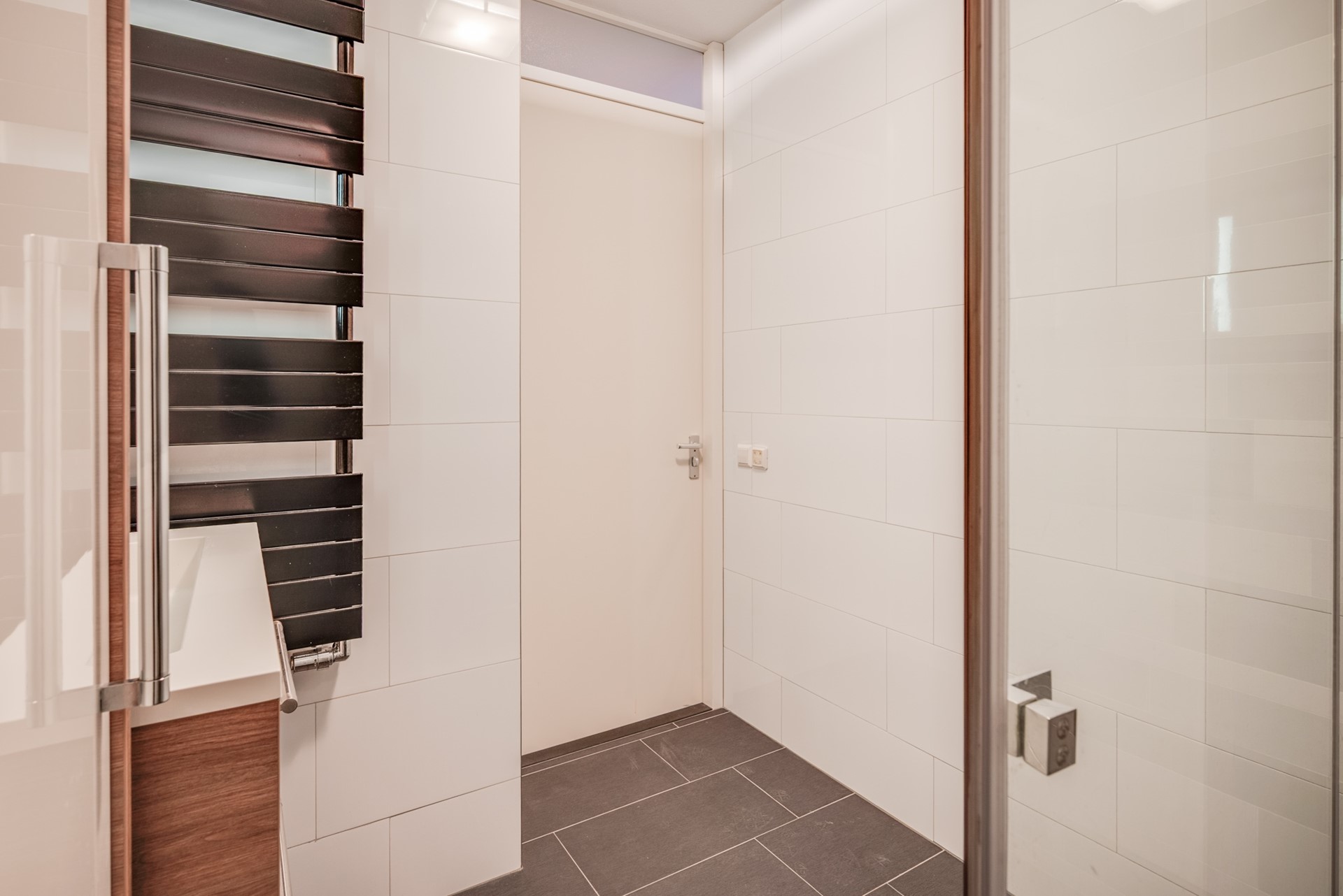• Moderne badkamer voorzien van een ruime inloopdouche, wastafel met meubel, wandspiegel, handdoekenkastje en designradiator.