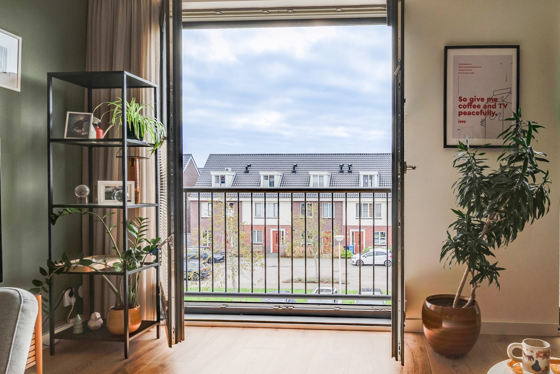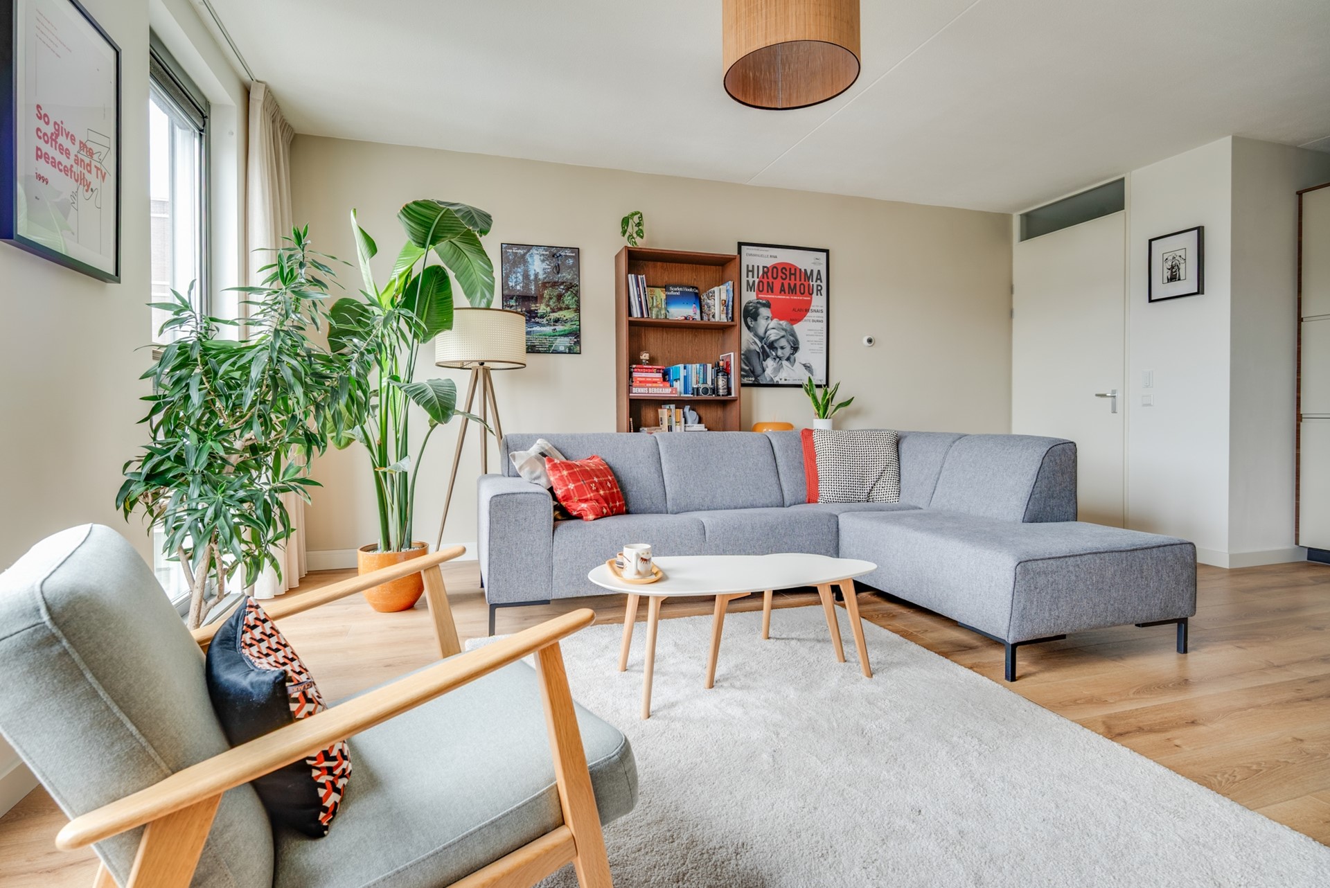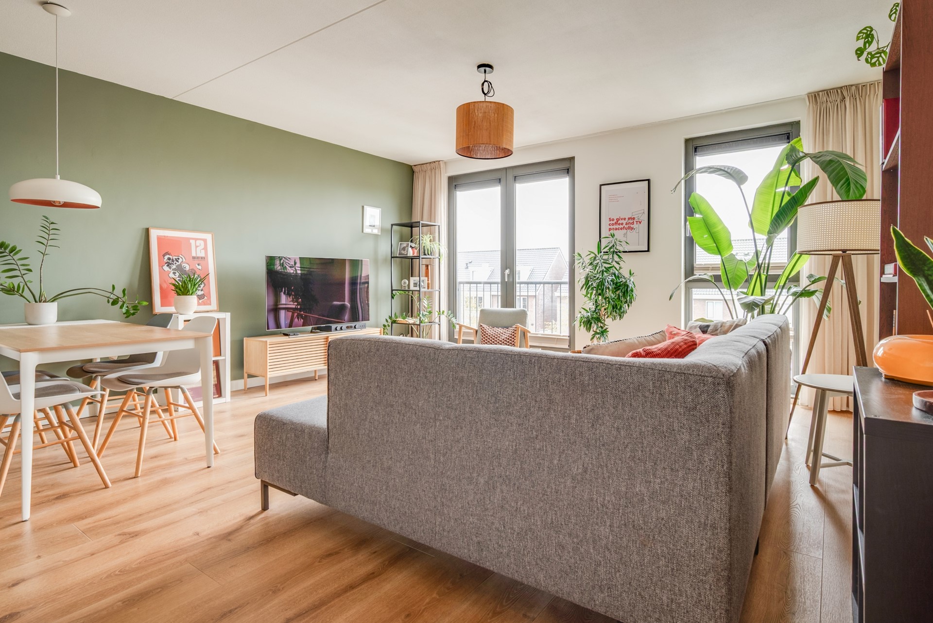 • Lichte woonkamer met elektrische sunscreens, vloerverwarming, frans balkon en zicht op de speeltuin aan de voorzijde.