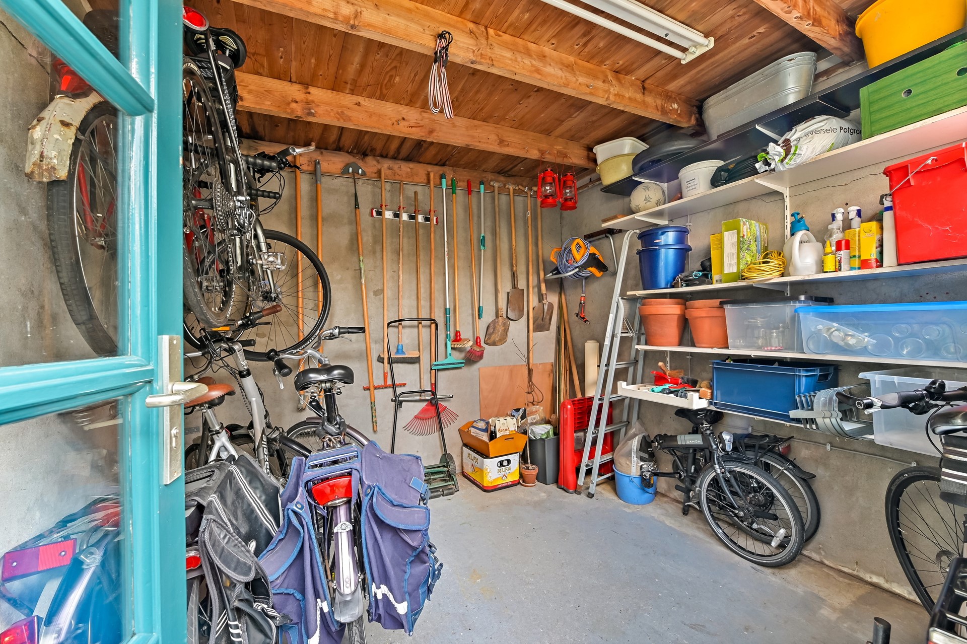 • De vrijstaande stenen berging aan de achterzijde is gelegen op een betonnen plaat en voorzien van elektra.