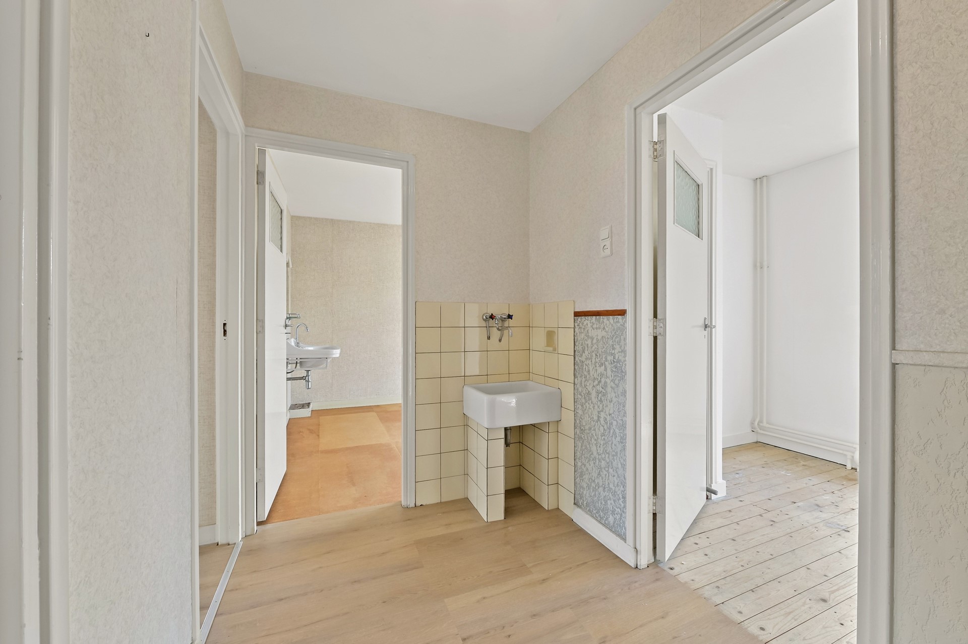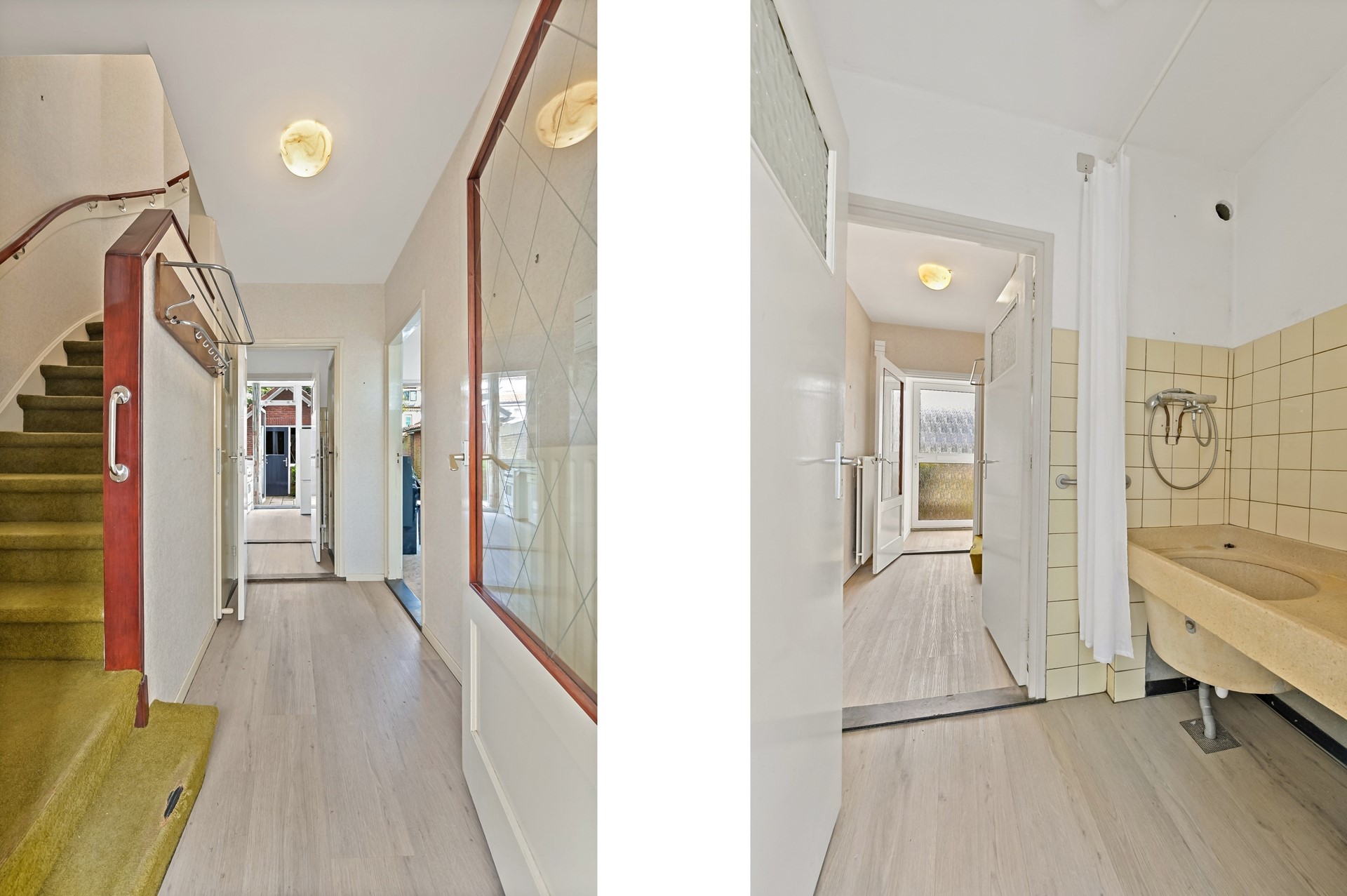 • De badkamer is nog in de oorspronkelijke staat en zal een koper waarschijnlijk naar de 1e etage willen verplaatsen; daar is voldoende ruimte voor boven.
