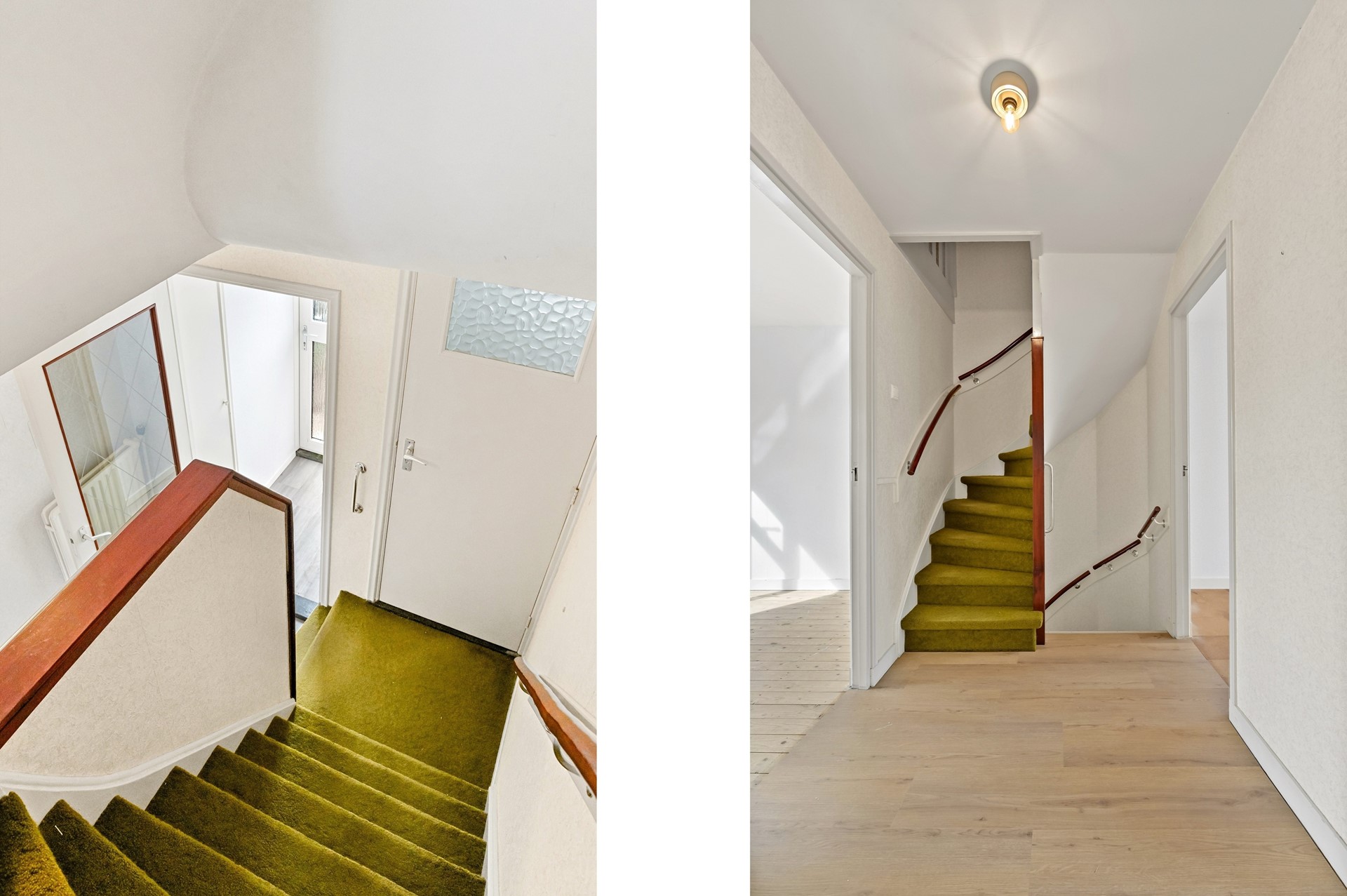 Entree naar hal met toilet, trapopgang en kelderkast. Toegang tot de woonkamer, keuken en naastgelegen badkamer.
