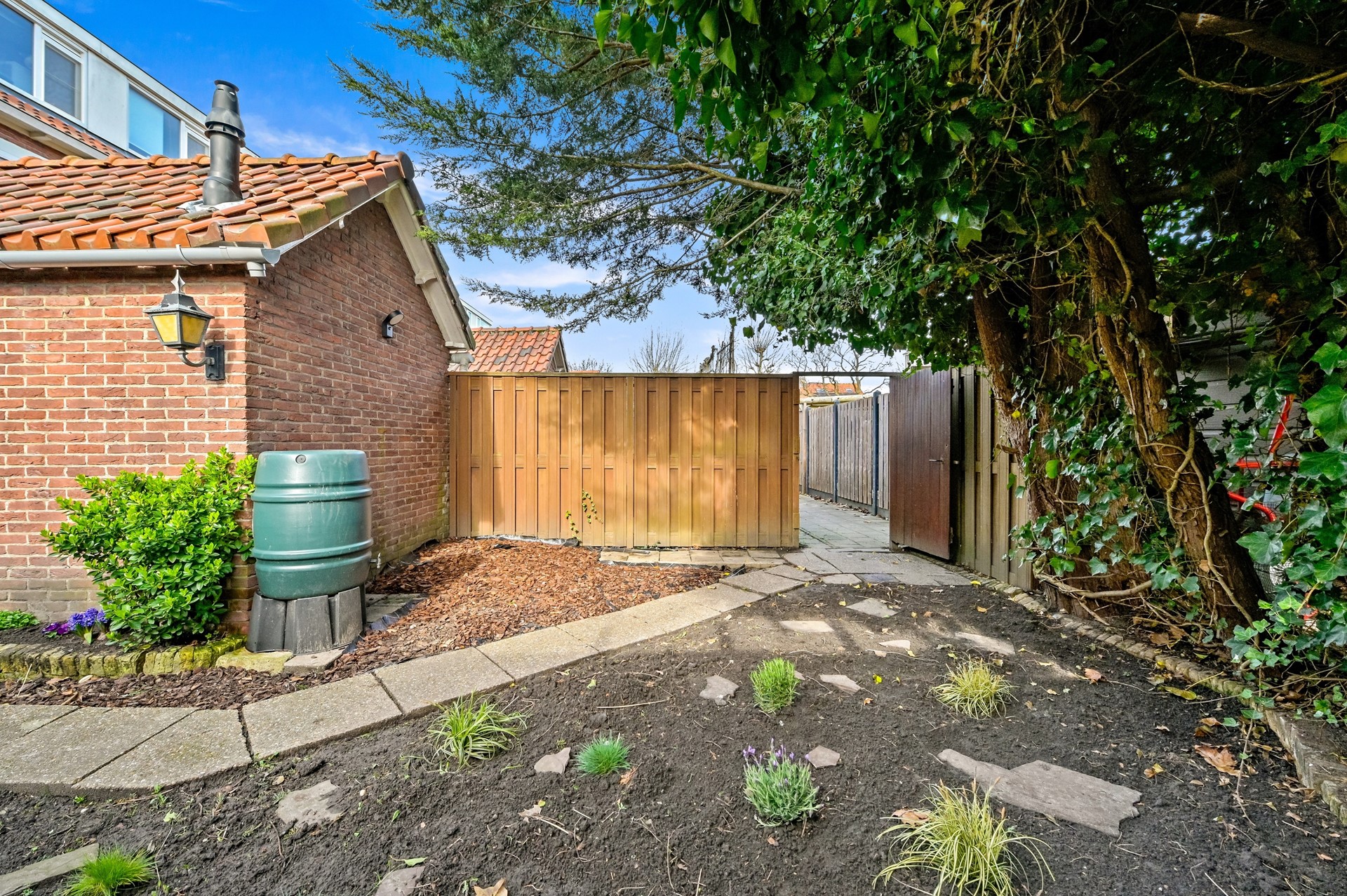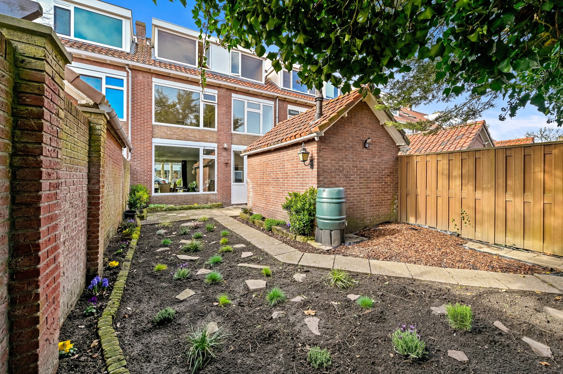 • Het betreft een object met 162 m² eigen grond. De poort loopt niet over het perceel van deze woning, maar stopt ernaast; daardoor is deze achtertuin ruim 1 meter dieper dan bij de buren.