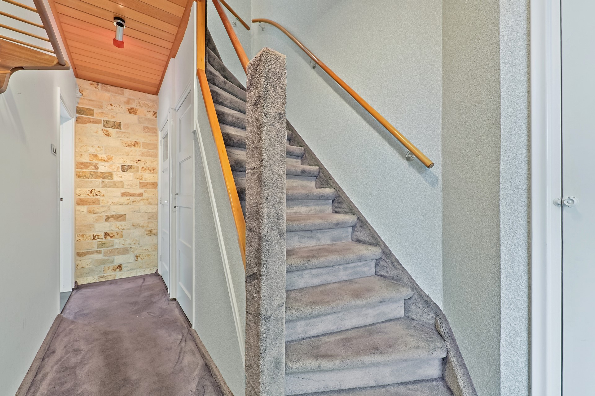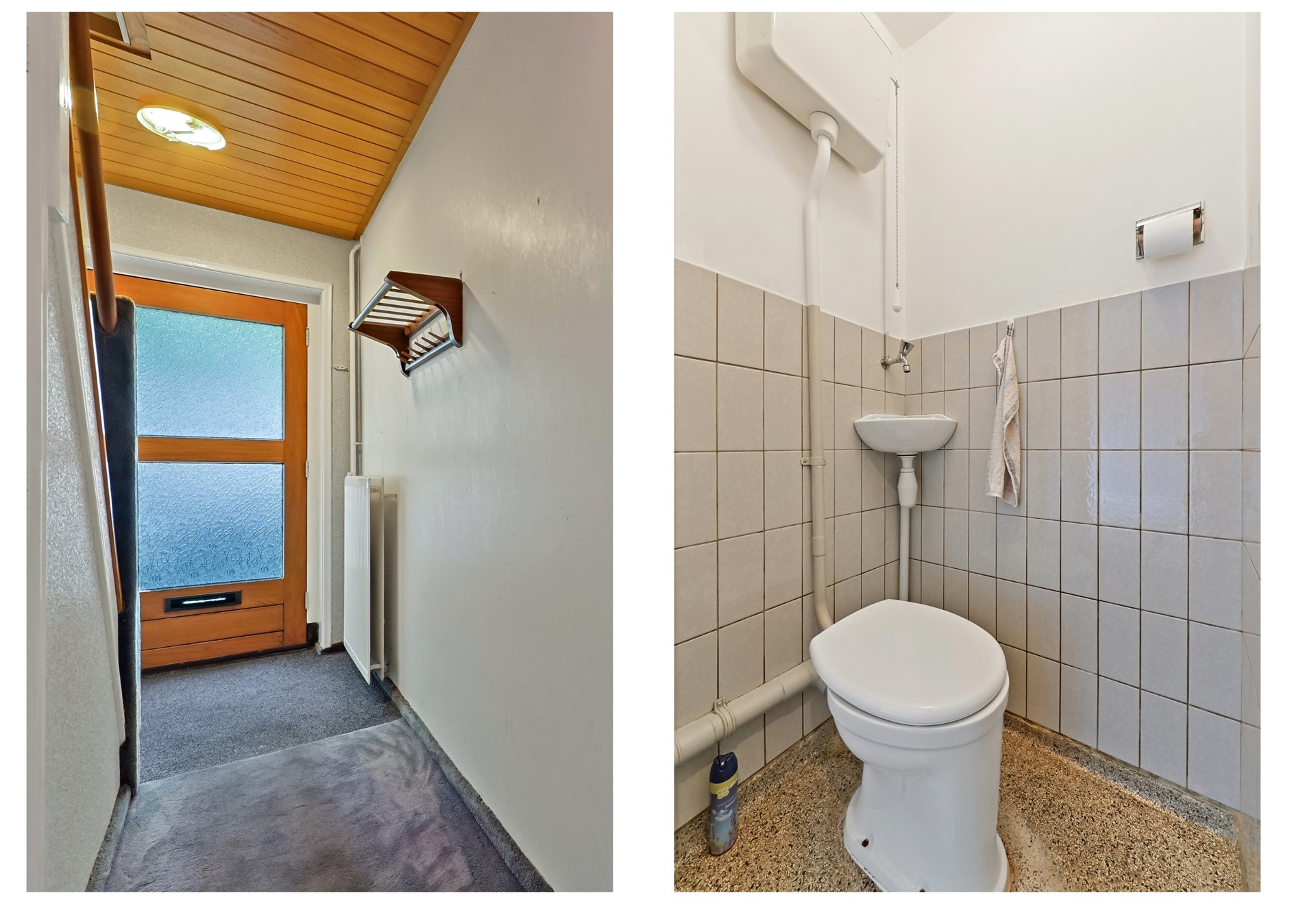 Entree naar hal met toilet, kelderkast en trapopgang.