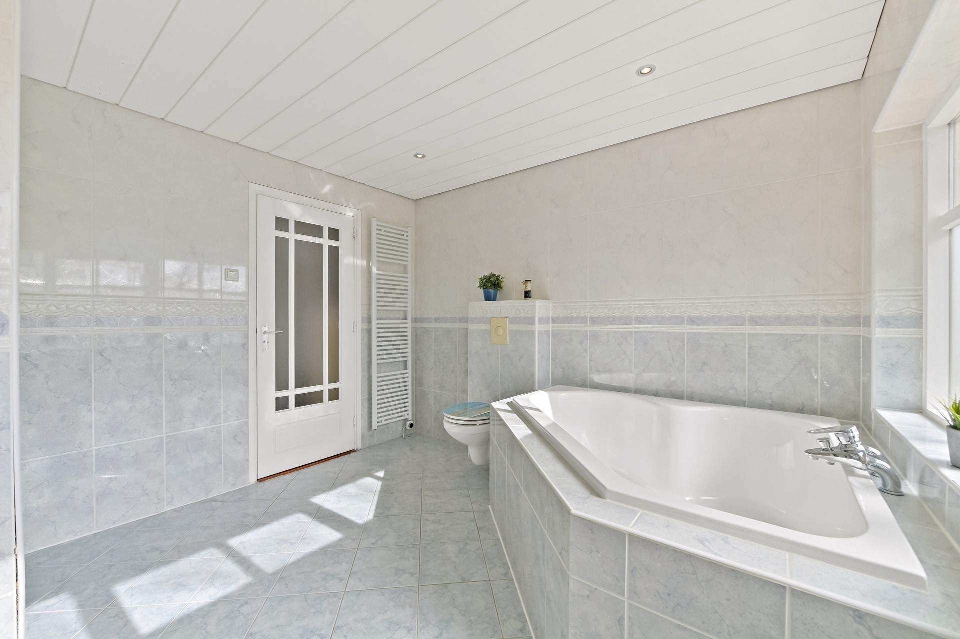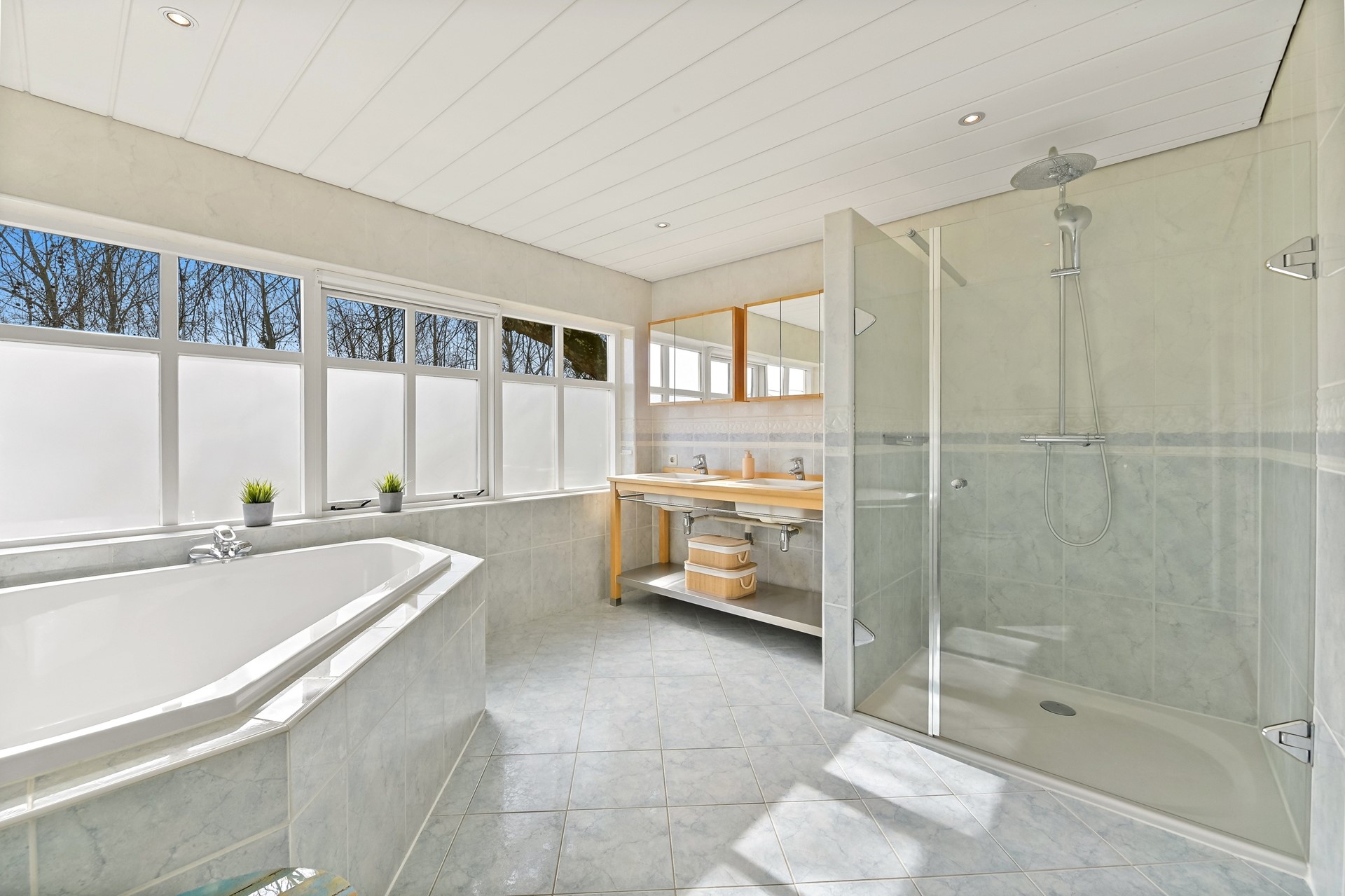 • De badkamer is gesitueerd in de opkamer en voorzien van een douchehoek, 2e toilet met zwevend closet, dubbele wastafel met meubel en hoekbad.
