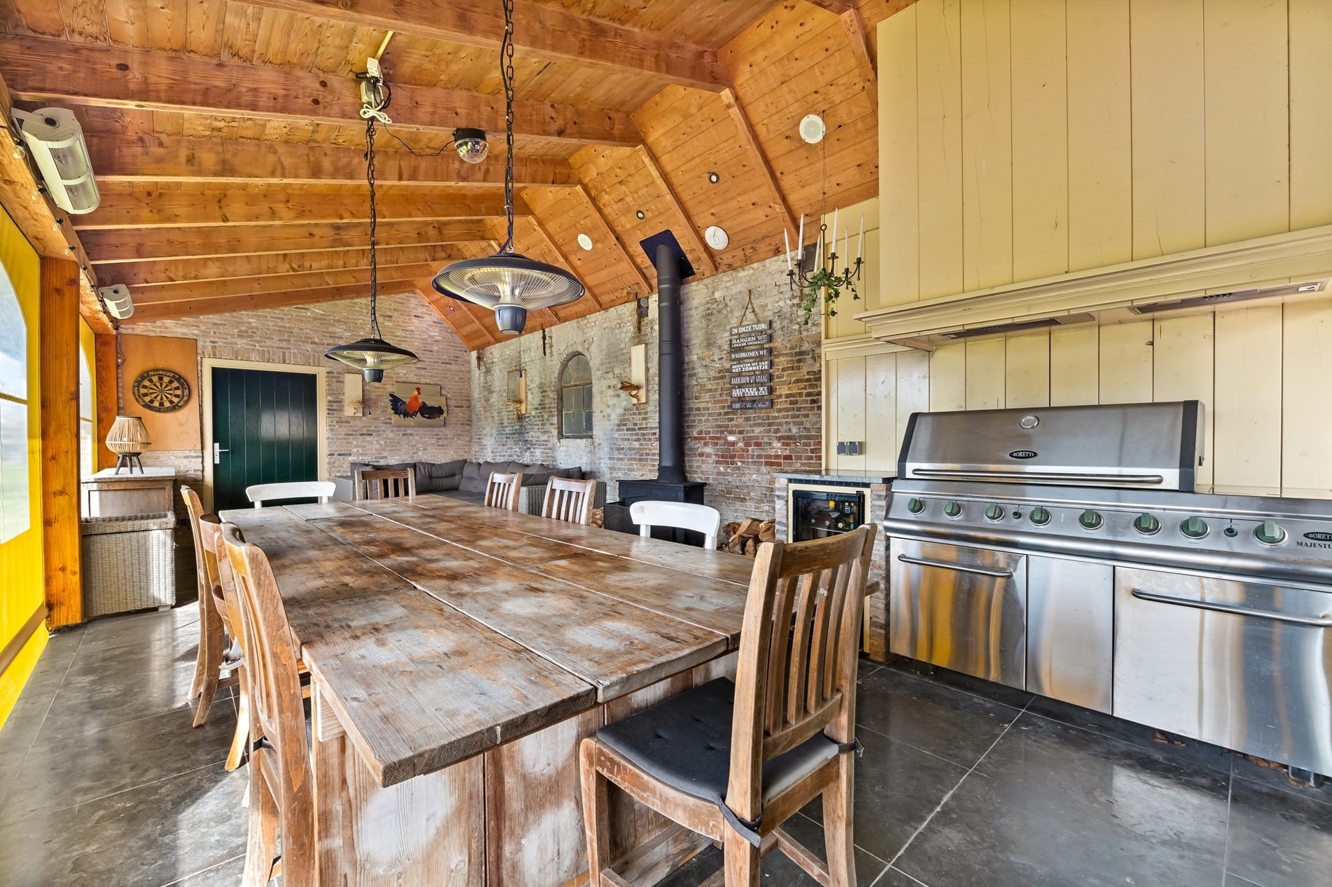 • Via de buitenzijde te bereiken veranda met heerlijke grote Boretti buitenkeuken met keukenkastjes en wasbak. De veranda is af te sluiten zodat er ook prettig in de luwte gezeten kan worden. Zonnige ligging op het westen waar u van de zonsondergang kunt genieten en het tevens de perfecte locatie is voor feestjes en ontspanning. Met een houtkachel voor als het wat kouder wordt.