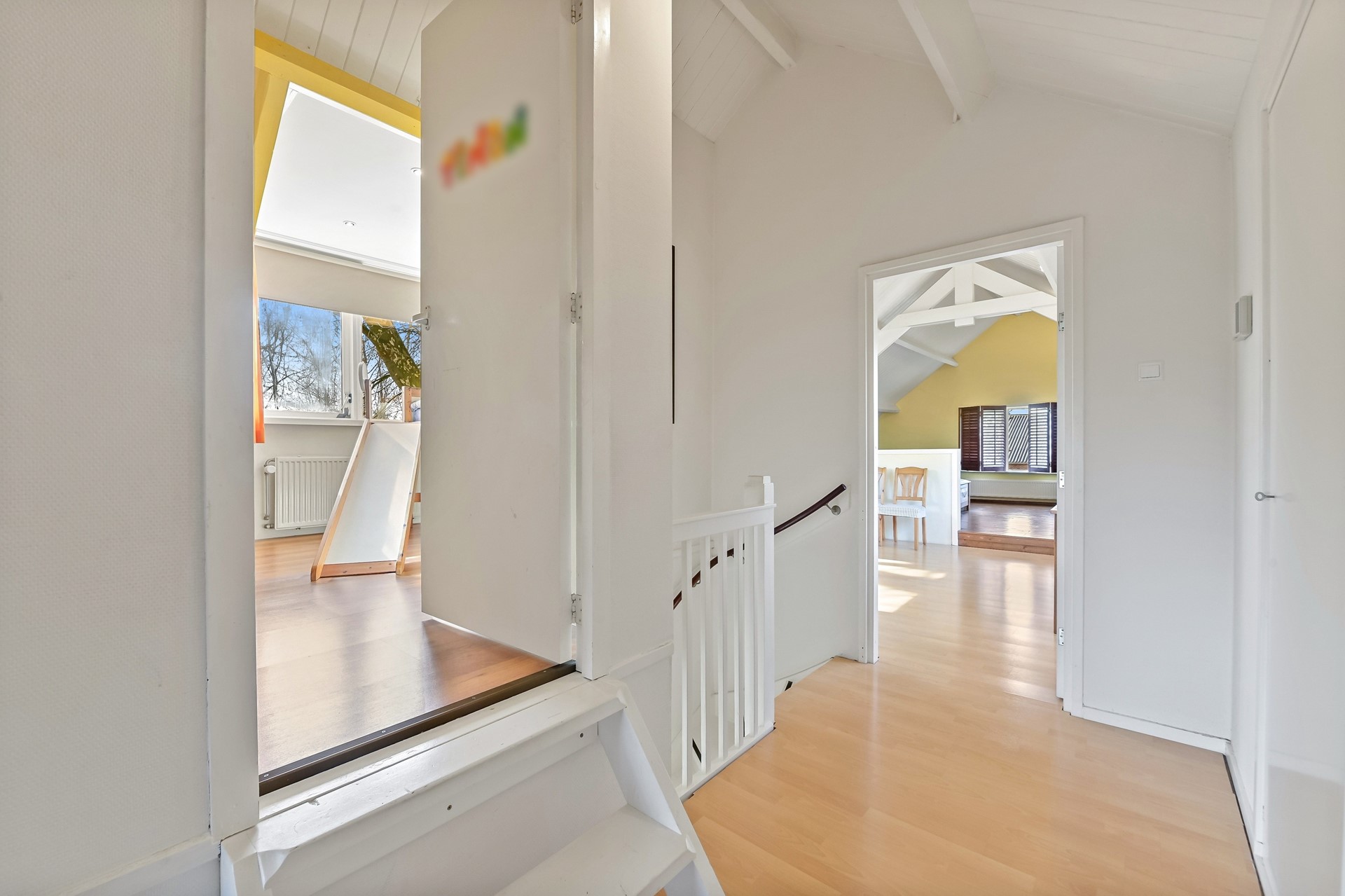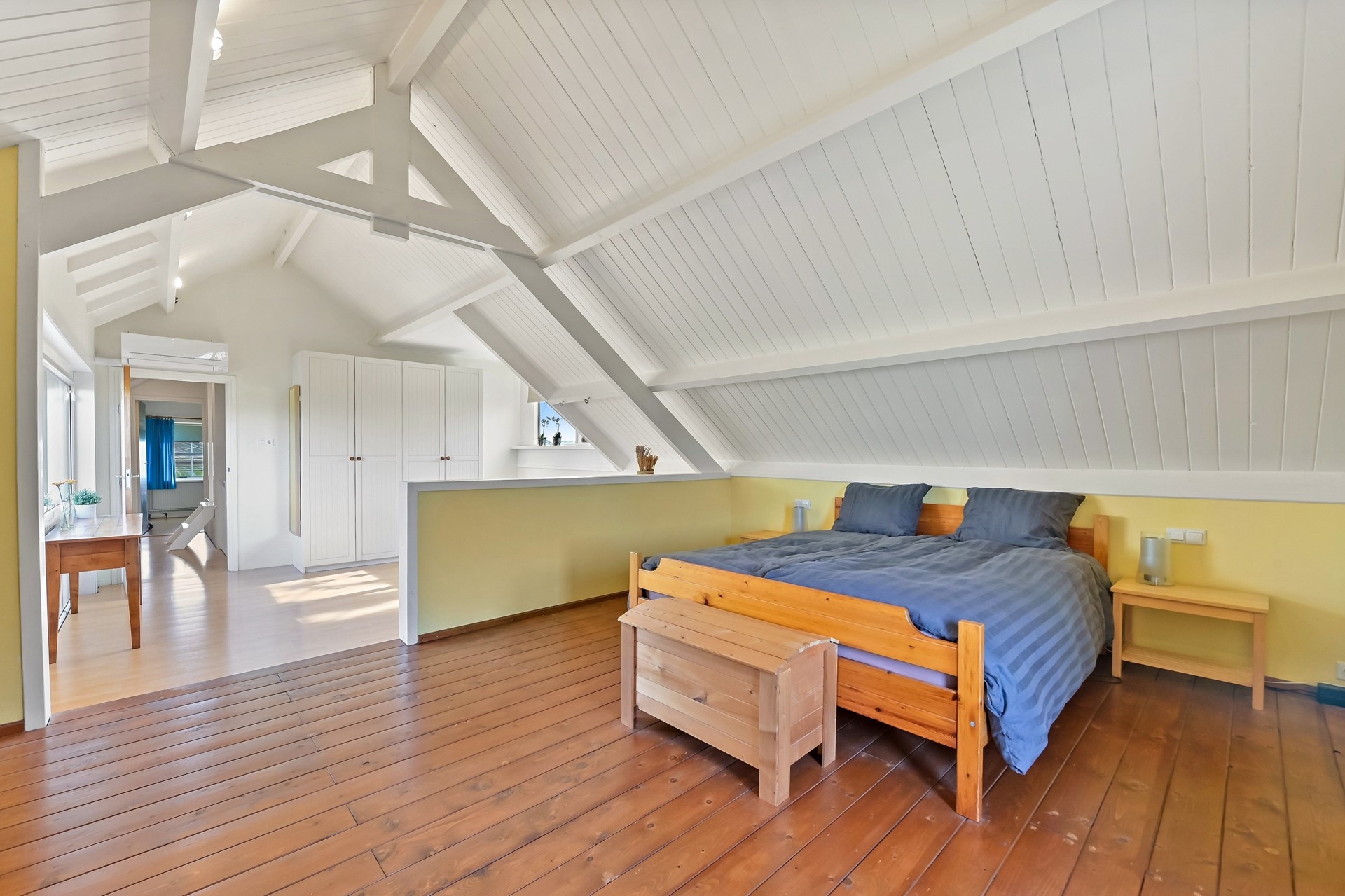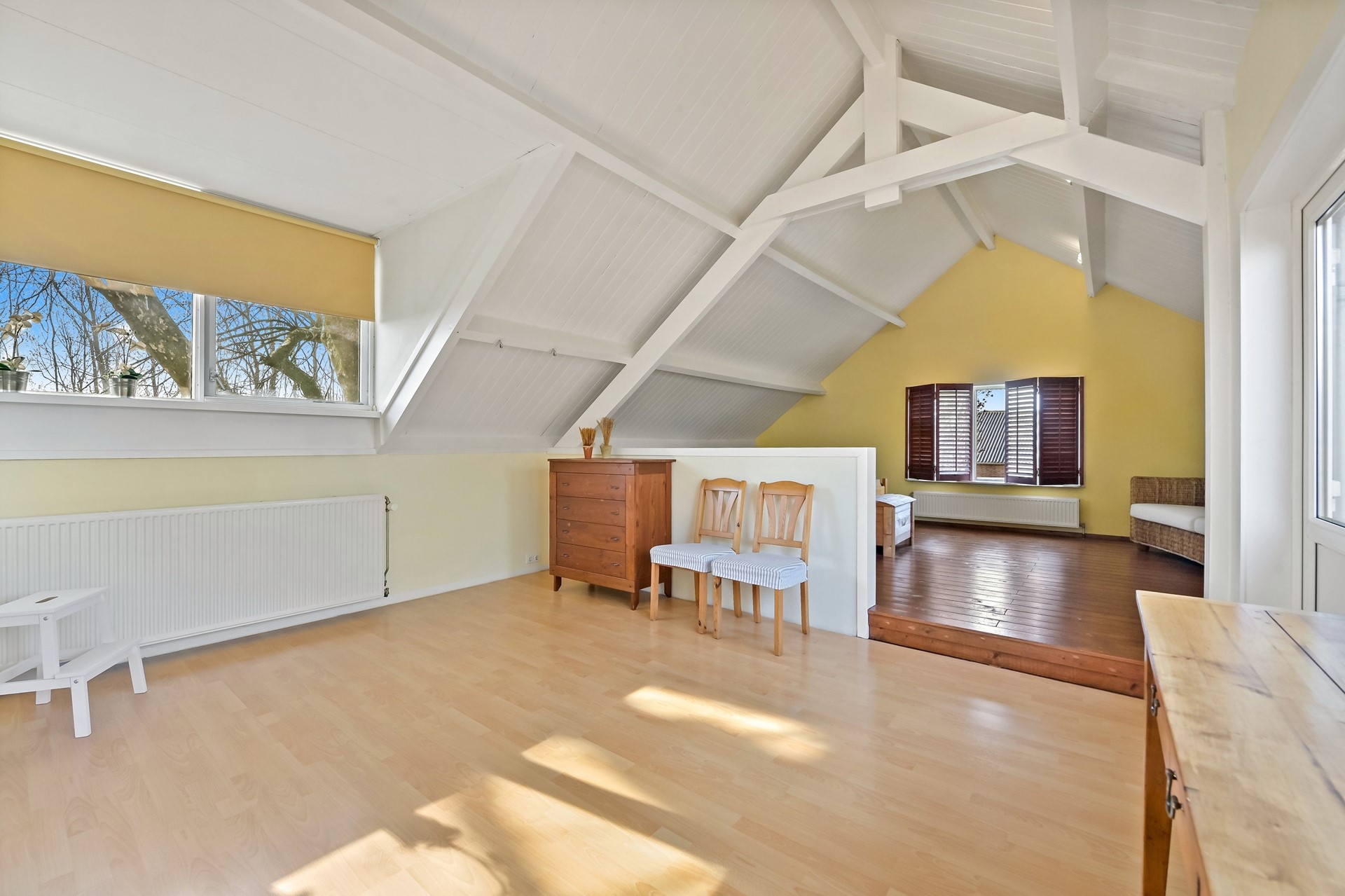 • Eerste etage met 2 slaapkamers een grote open overloop met daarachter een zeer ruime 3e slaapkamer (met hoog en authentiek balkenplafond).
