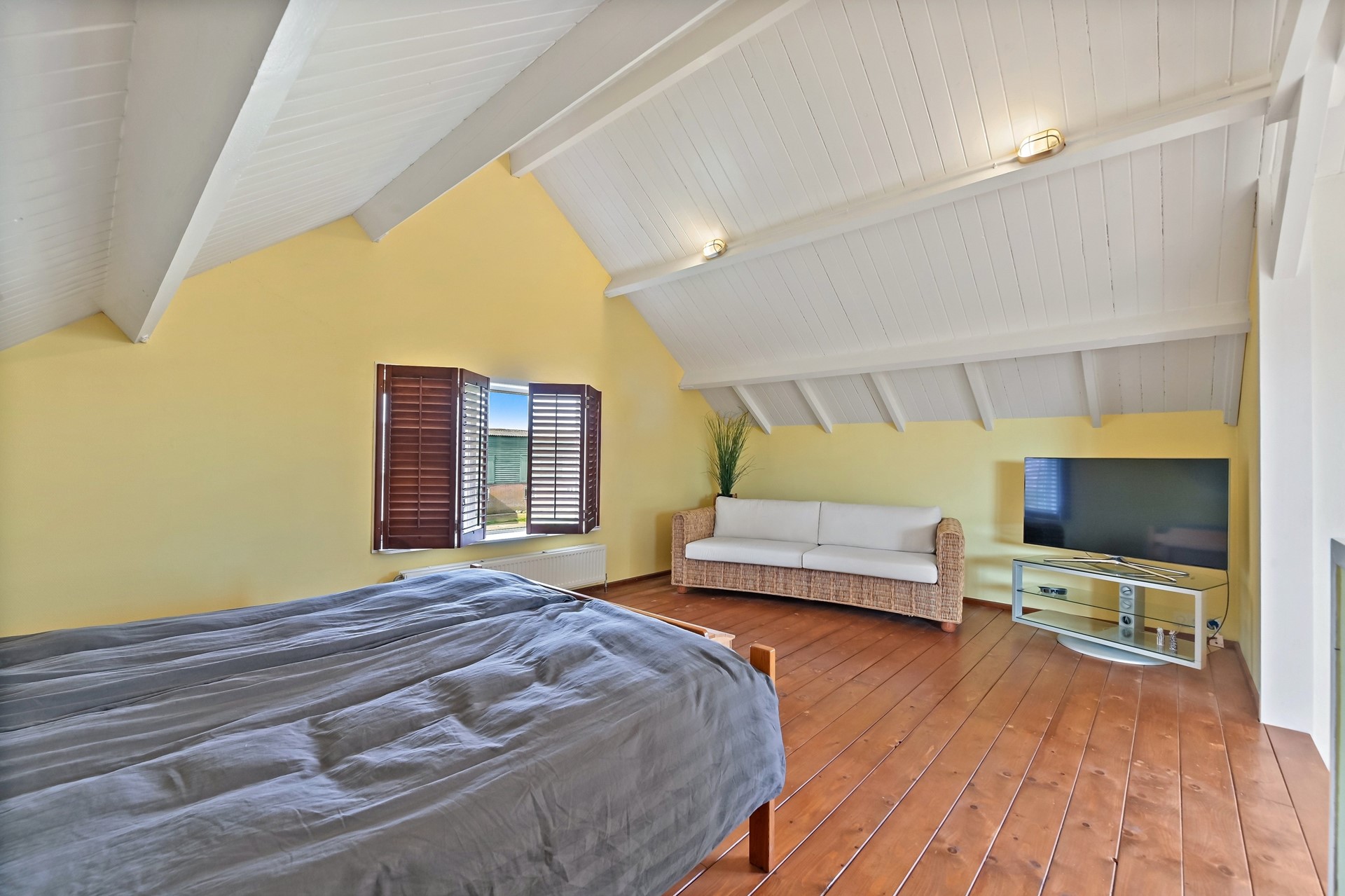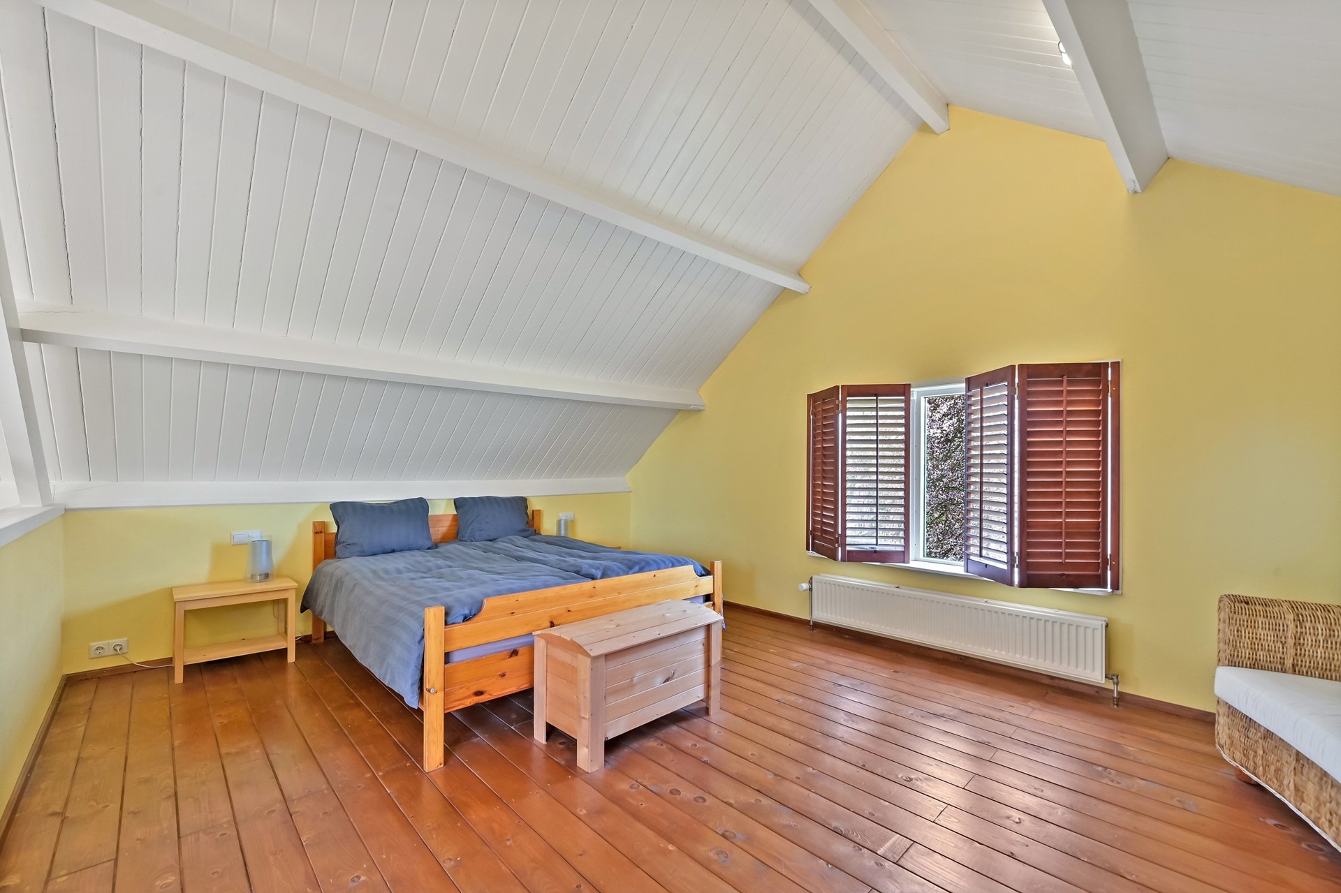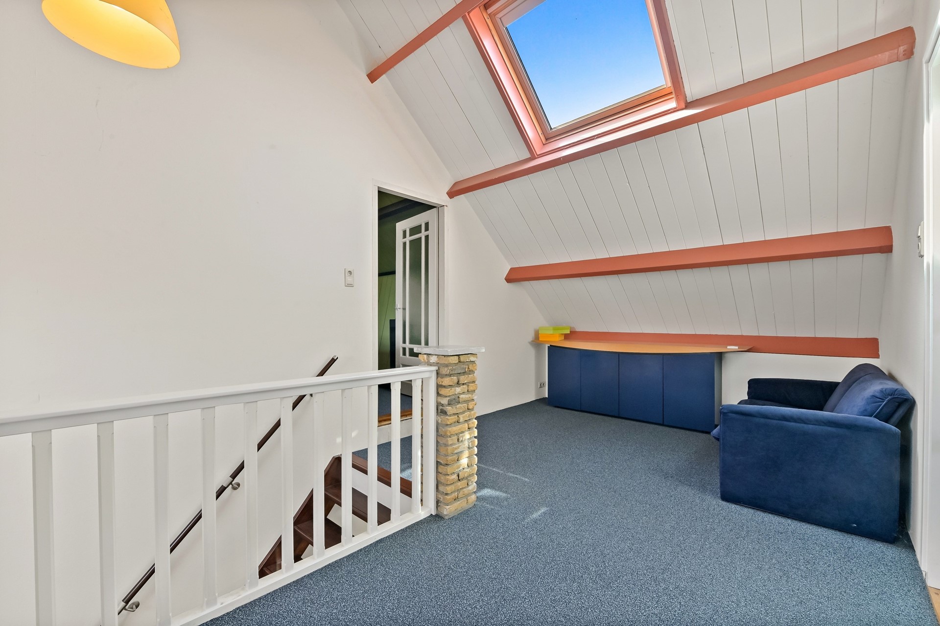 • Eerste etage met 2 slaapkamers een grote open overloop met daarachter een zeer ruime 3e slaapkamer (met hoog en authentiek balkenplafond).