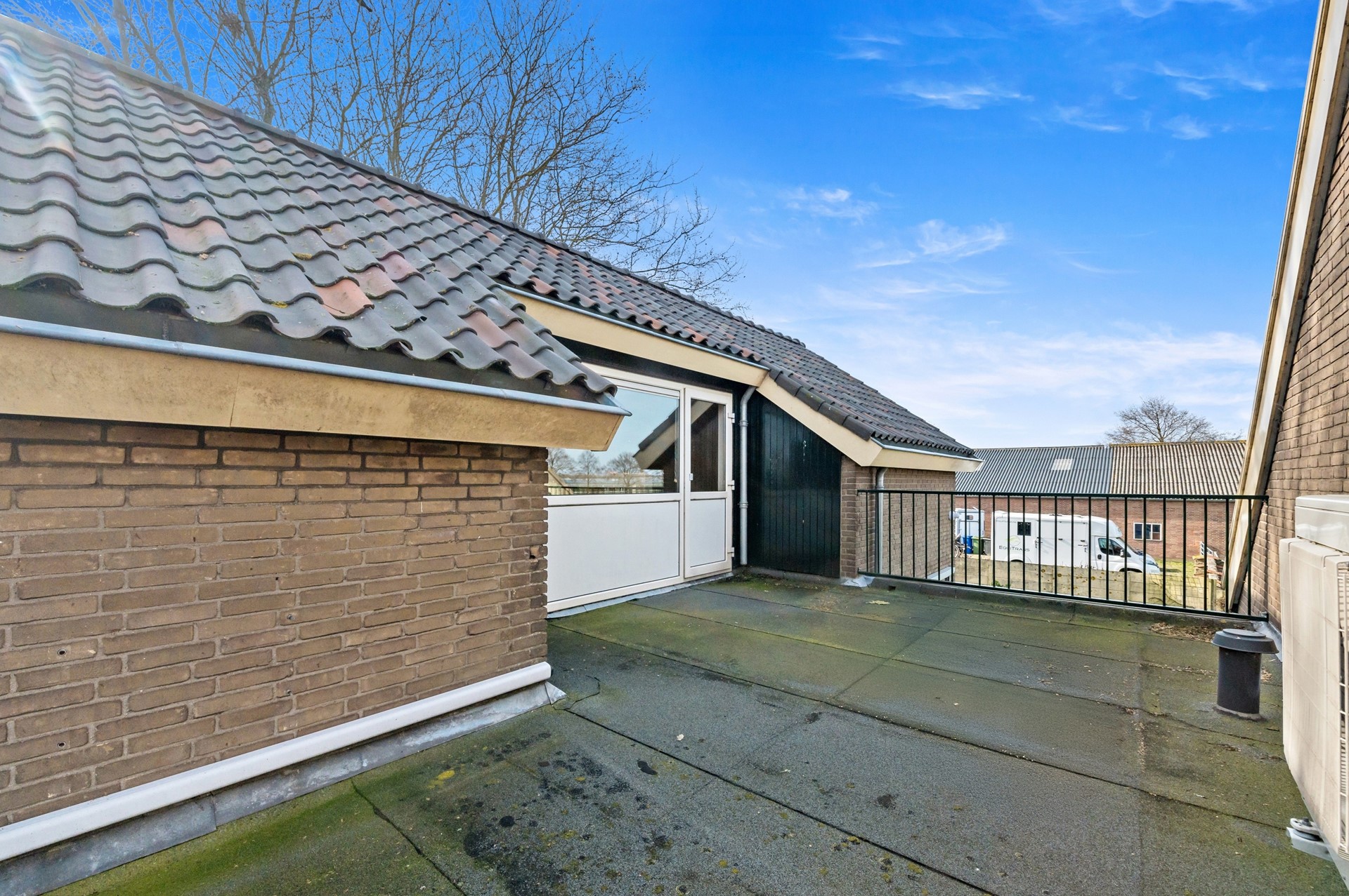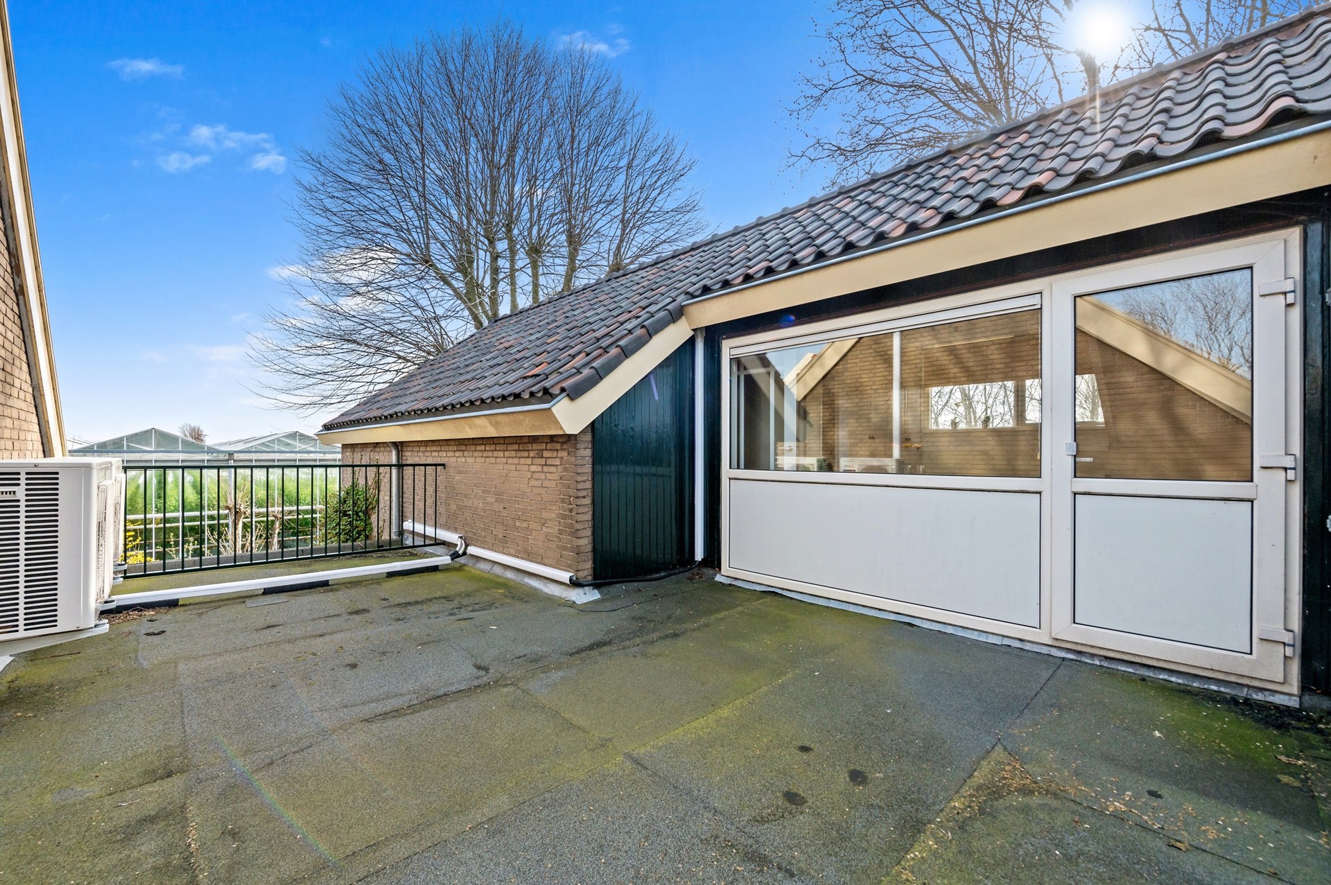 Ruim balkon tussen het woonhuis en de voormalige stal.