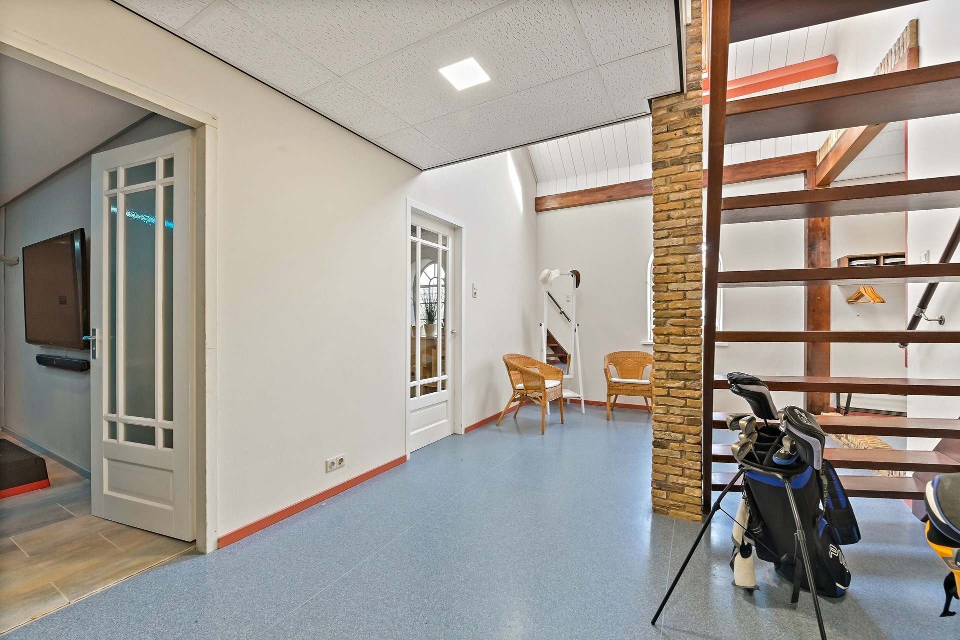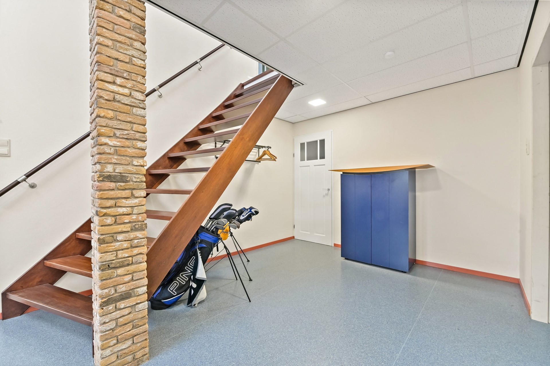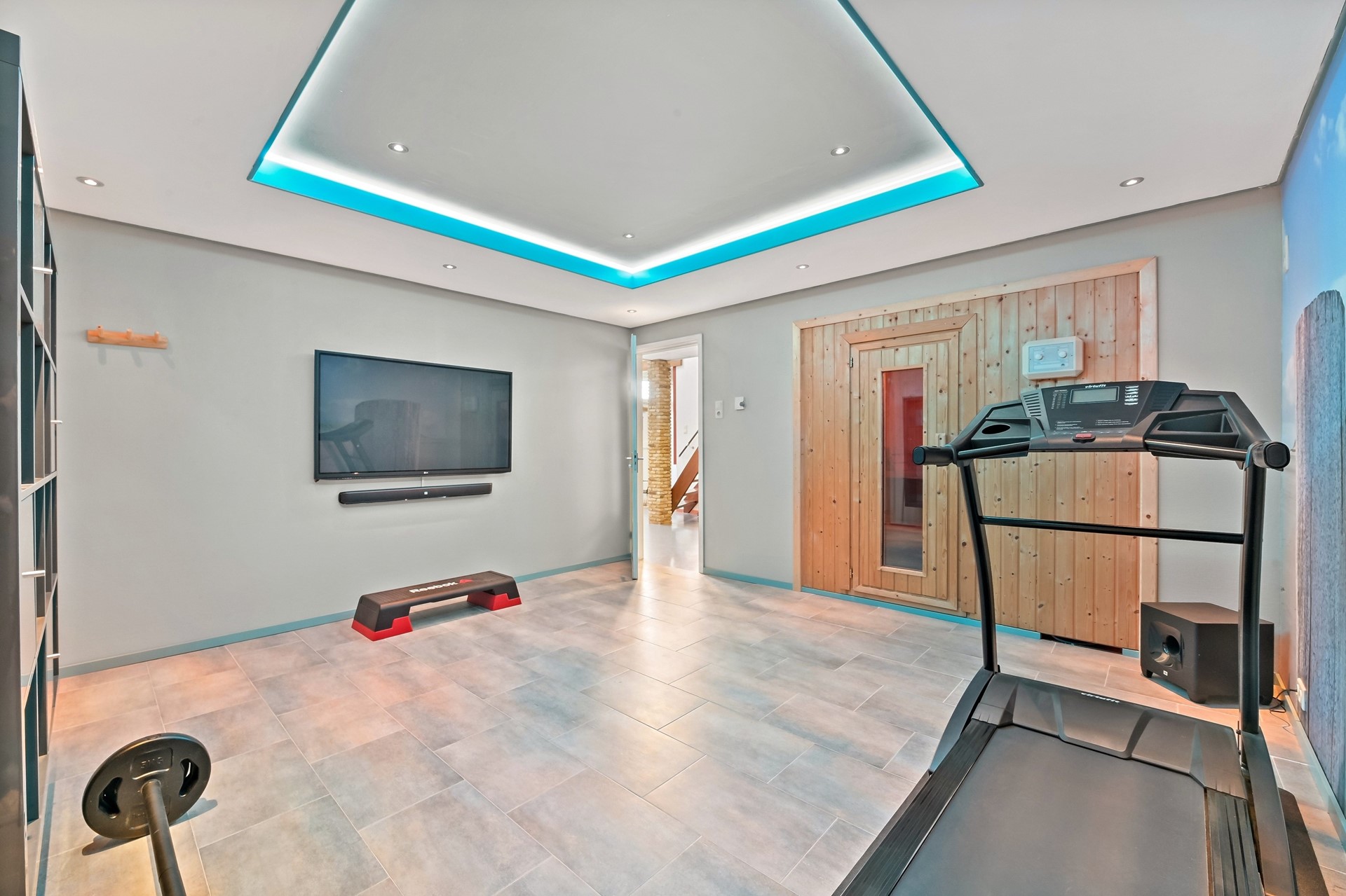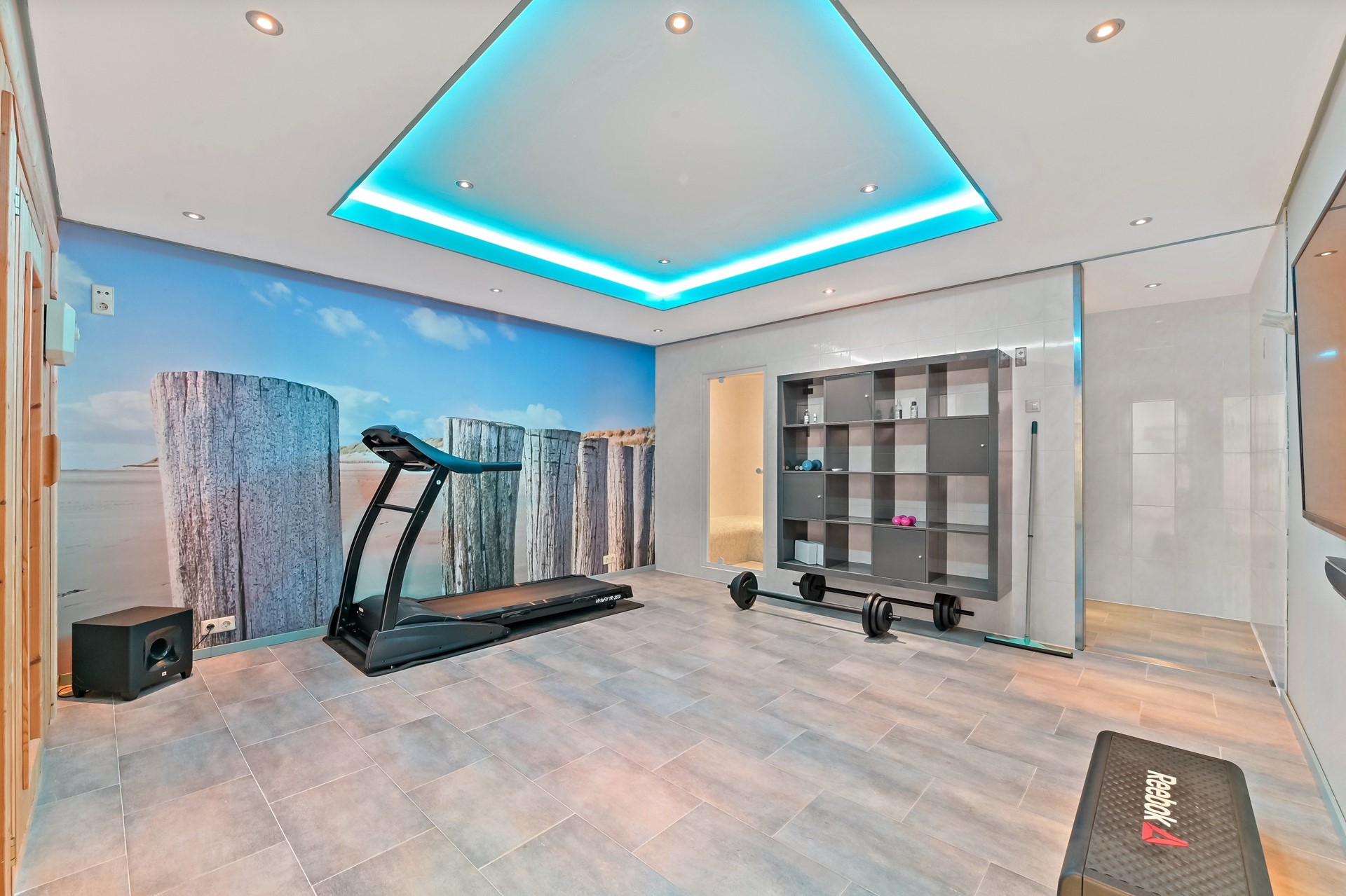 Ruime hal met trapopgang, bergruimte, fitness/wellness-ruimte en een bijkeuken annex wasruimte met technische ruimte.