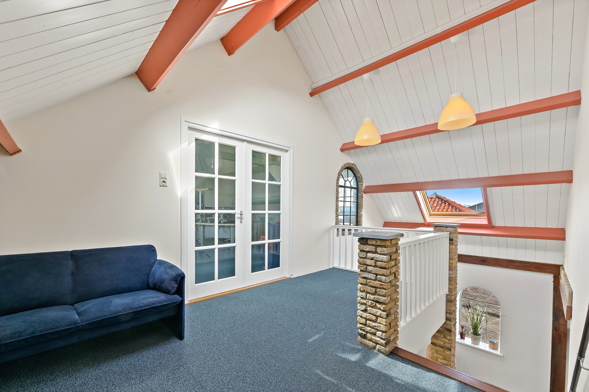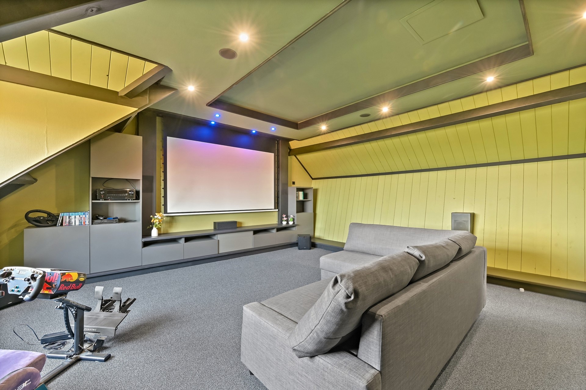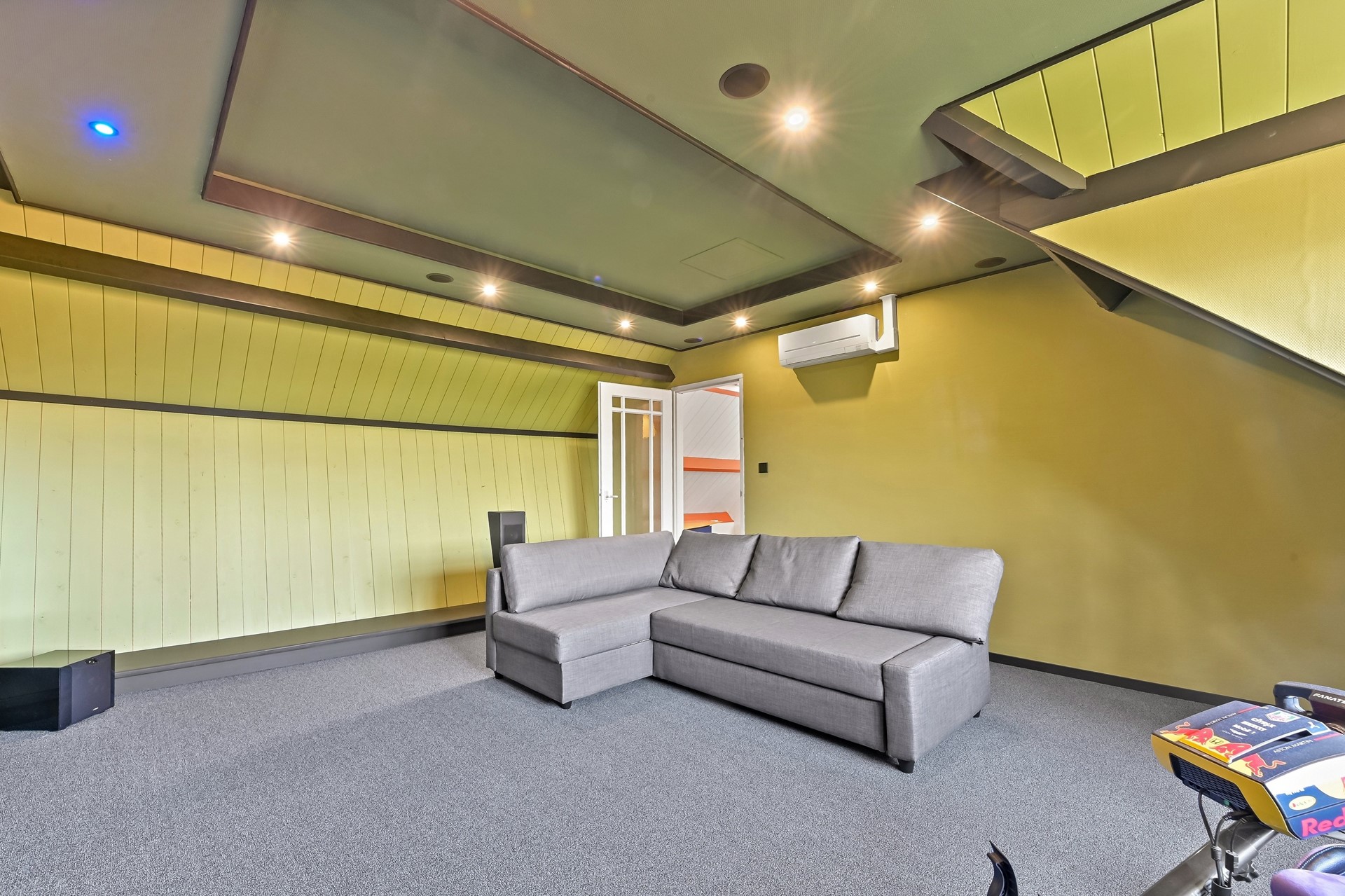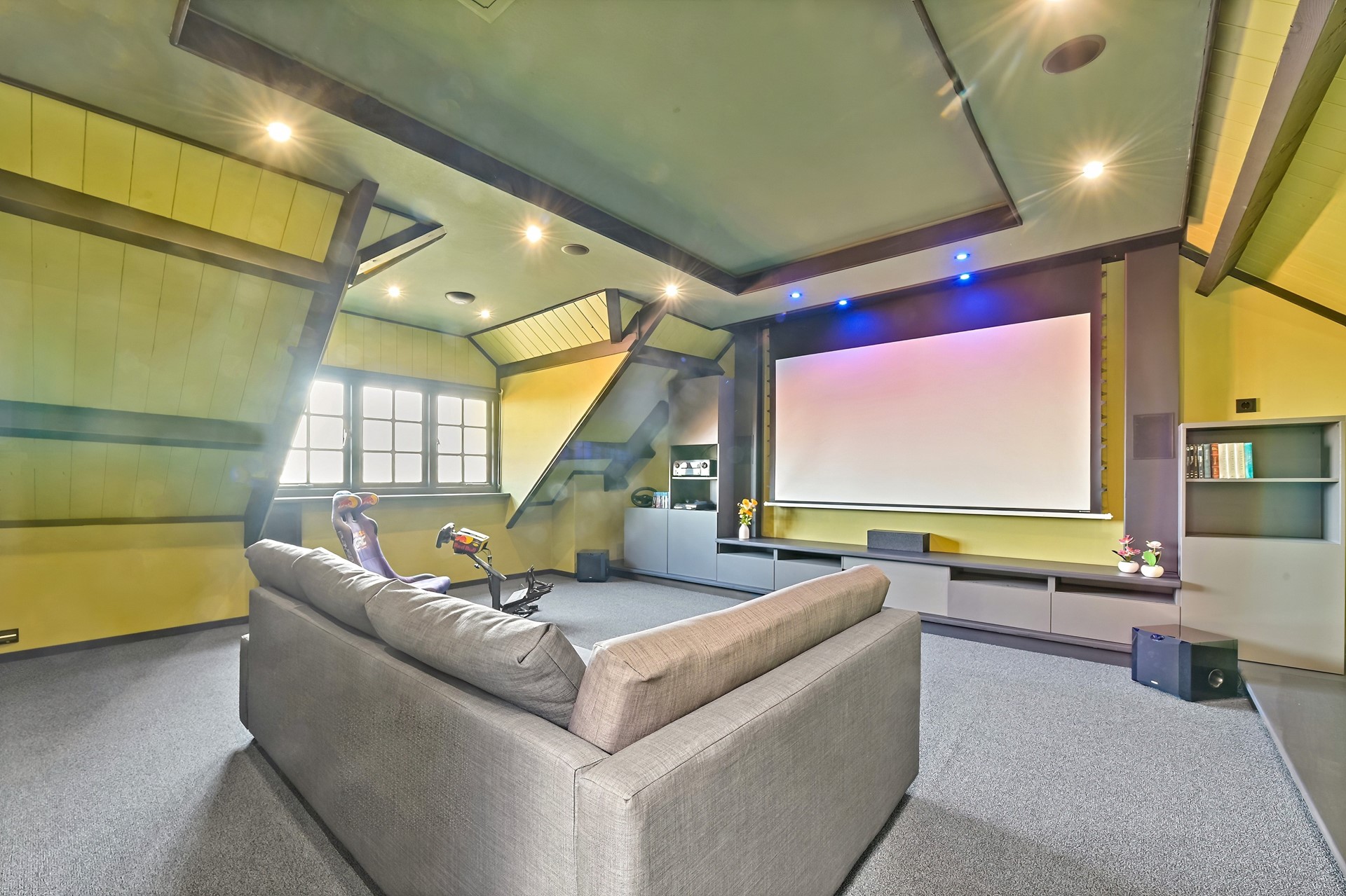 • Via de trap is er toegang tot de entresol met een grote thuisbioscoop/game-room en een nog grotere kantoorruimte met dakramen.