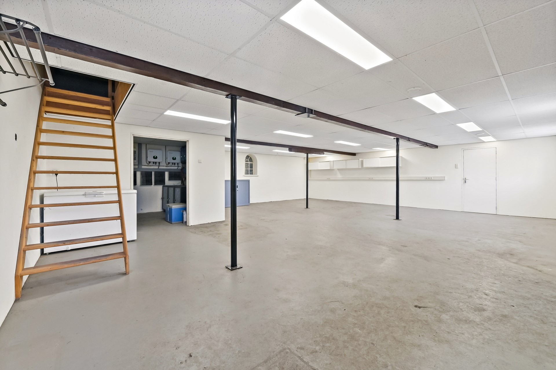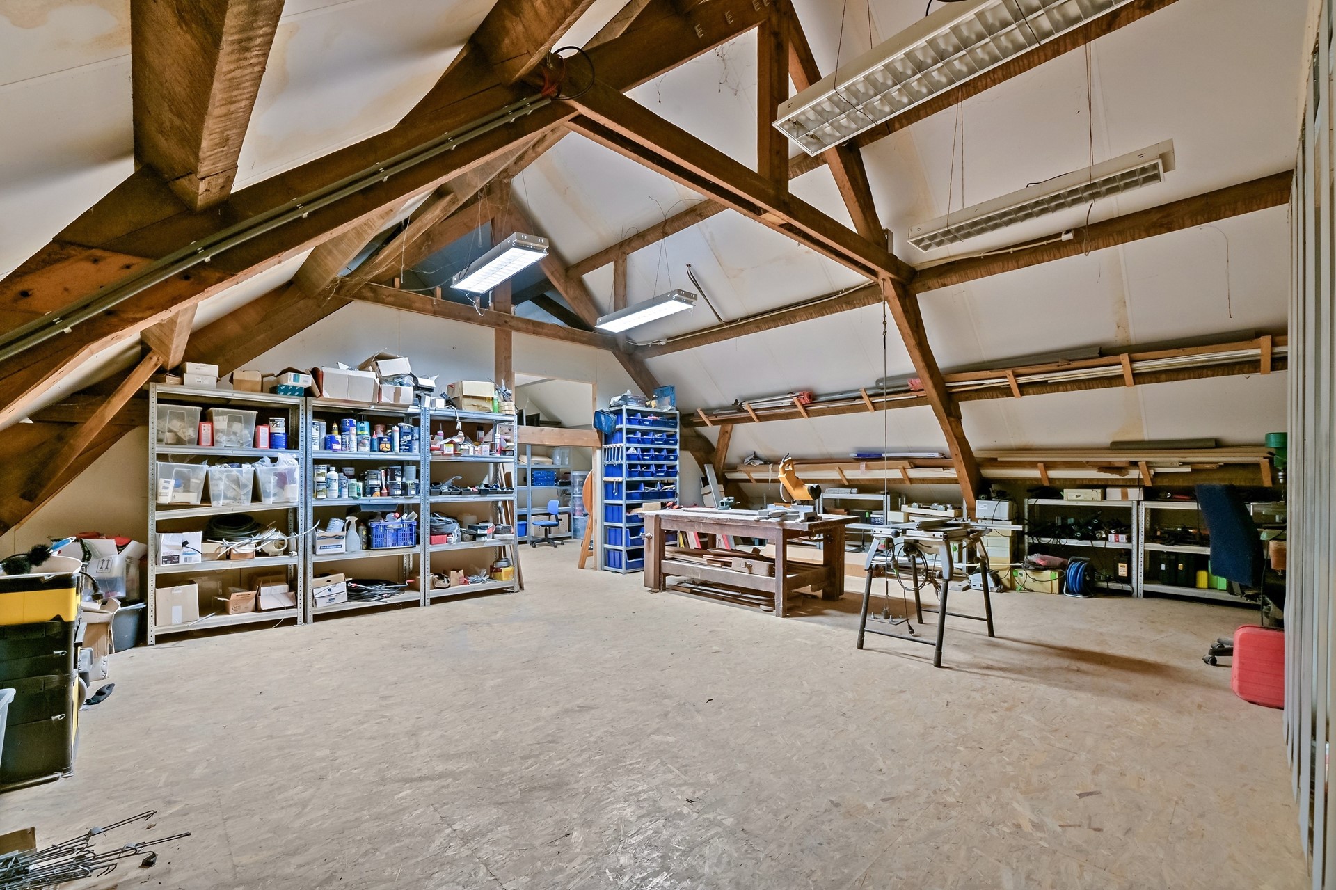 • De verdieping boven de garage heeft een werkplaats met veel bergruimte welke verdeeld is in twee afzonderlijke ruimten.