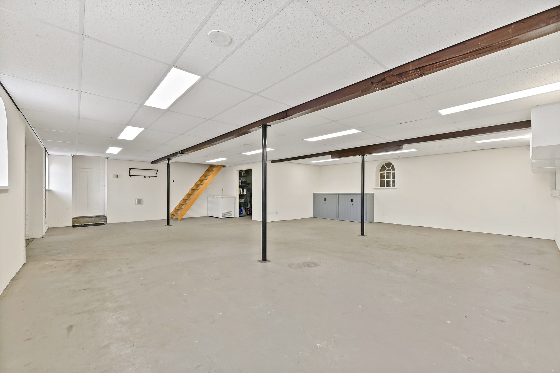 Entree naar hal met toilet. Slaap-/werkkamer, badkamer, woonkamer, keuken en kelder. Grote kantoorruimte en naastgelegen bijkeuken met toilet.