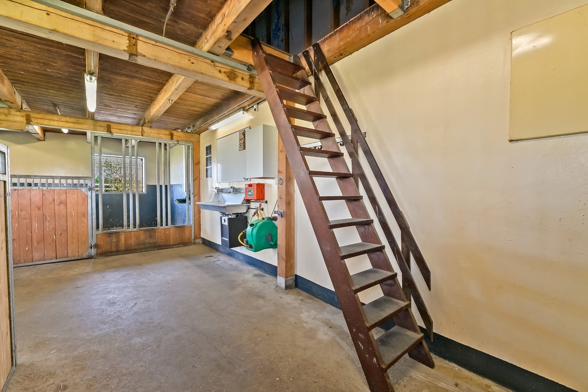 Aan de achterzijde is de stal met 2 paardenboxen en ruimte voor 3 paarden met een naastgelegen aparte zadelkamer; tevens bevindt zich boven de stallen een hooizolder met ruimte voor een jaarronde hooi opslag.