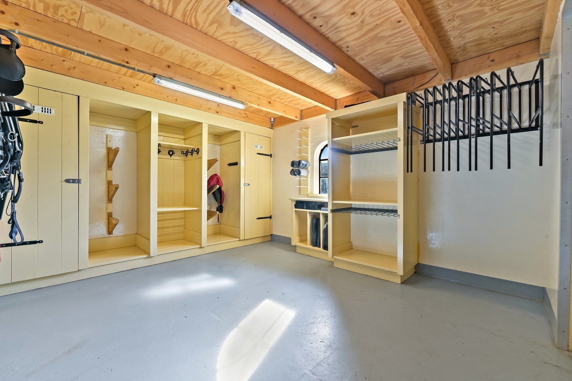 De verdieping boven de garage heeft een werkplaats met veel bergruimte die verdeeld is in twee afzonderlijke ruimten.