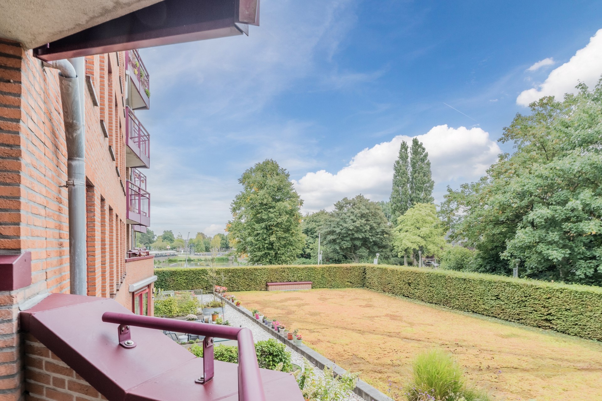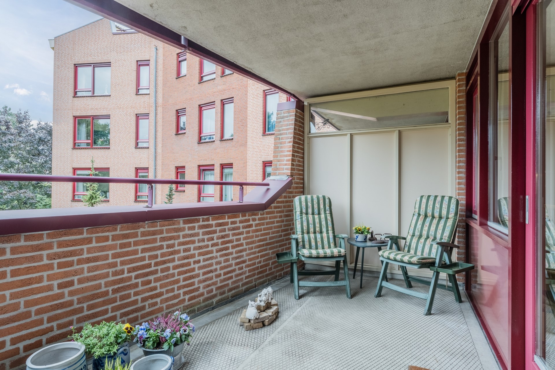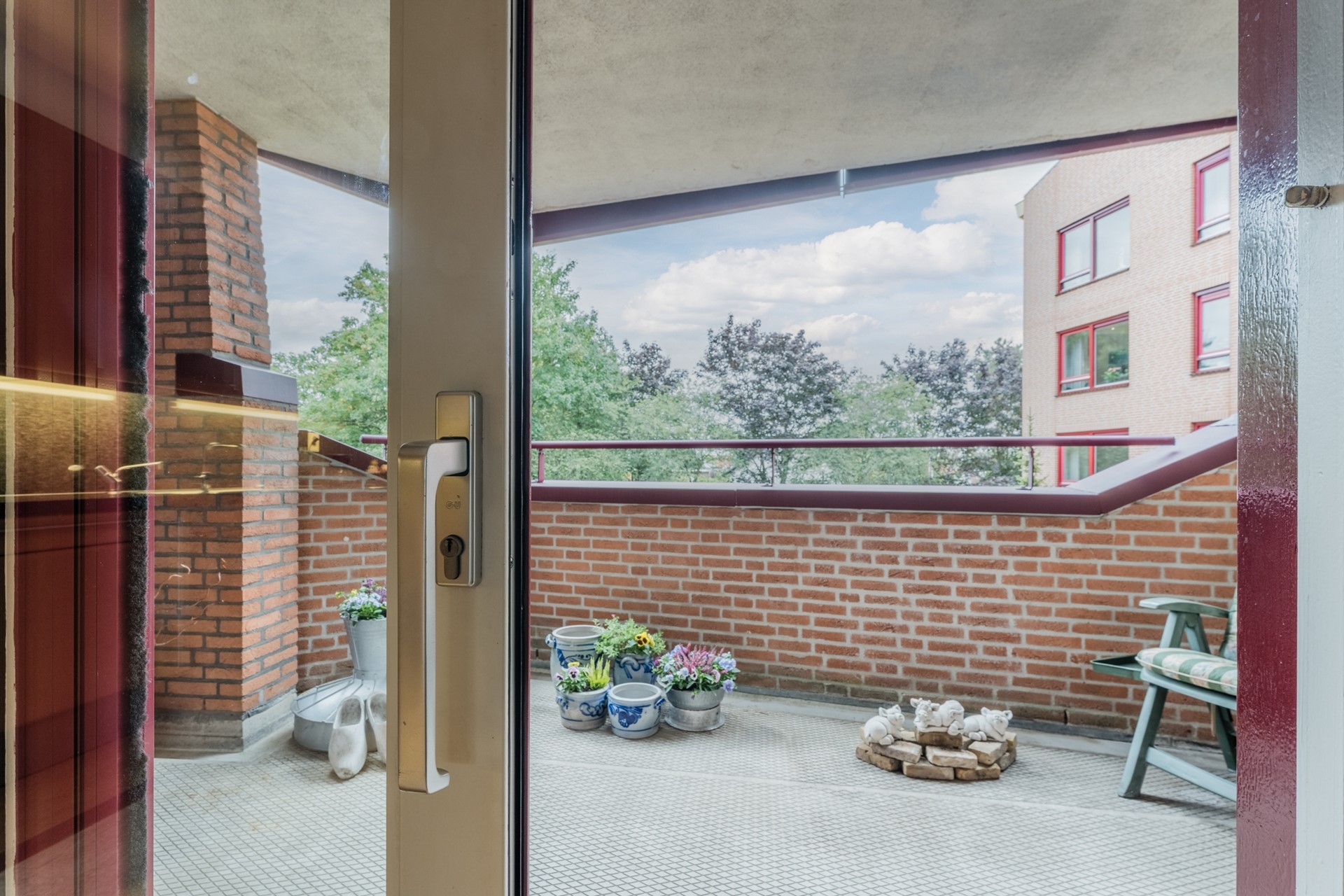 Prettig balkon van ca. 10 m² met leuk uitzicht op een grasveldje en groen.