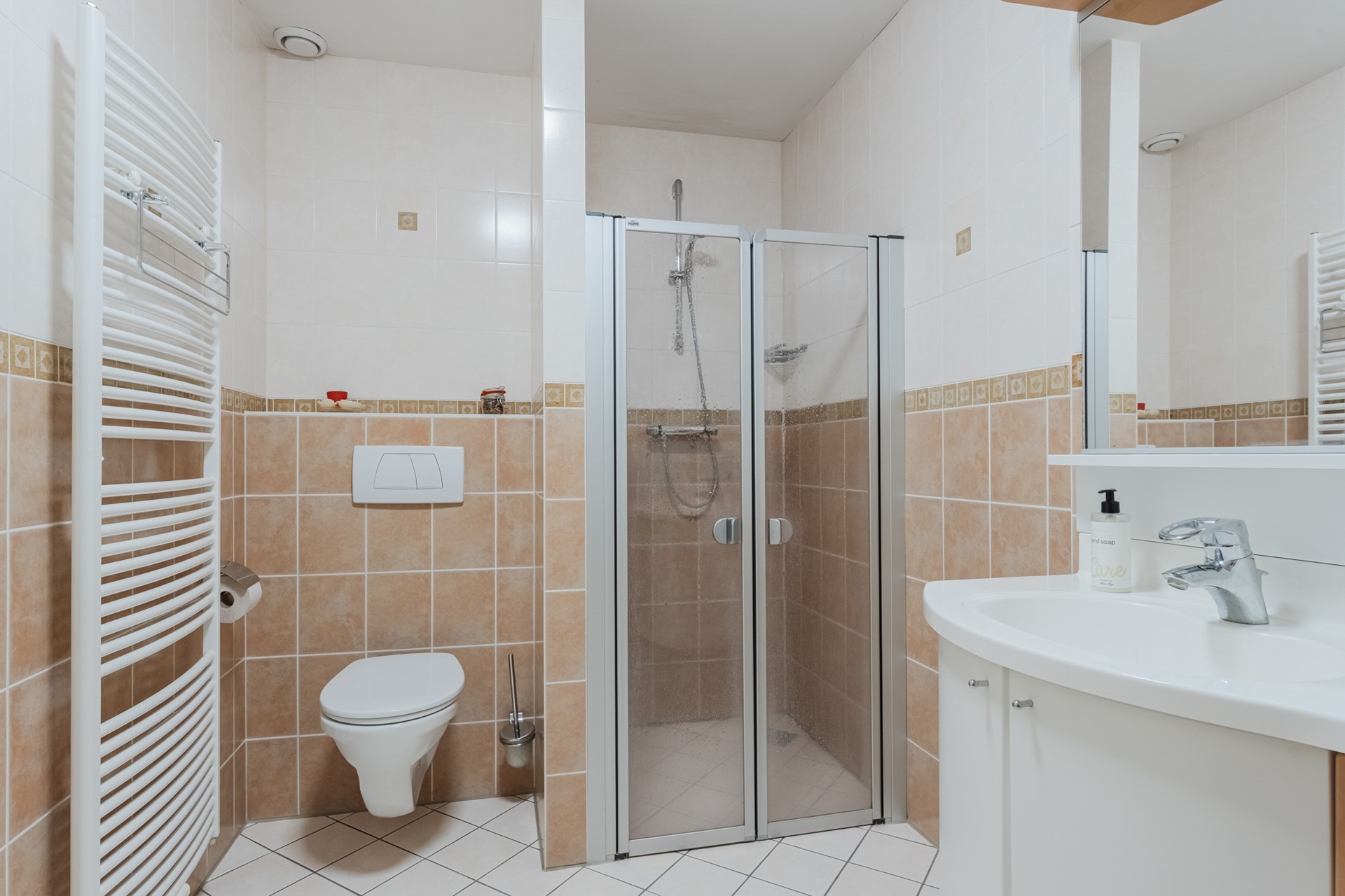• De badkamer is volledig betegeld en van alle gemakken voorzien; een inloopdouche, 2e toilet met zwevend closet, wastafel met meubel, ligbad en handdoekradiator.
