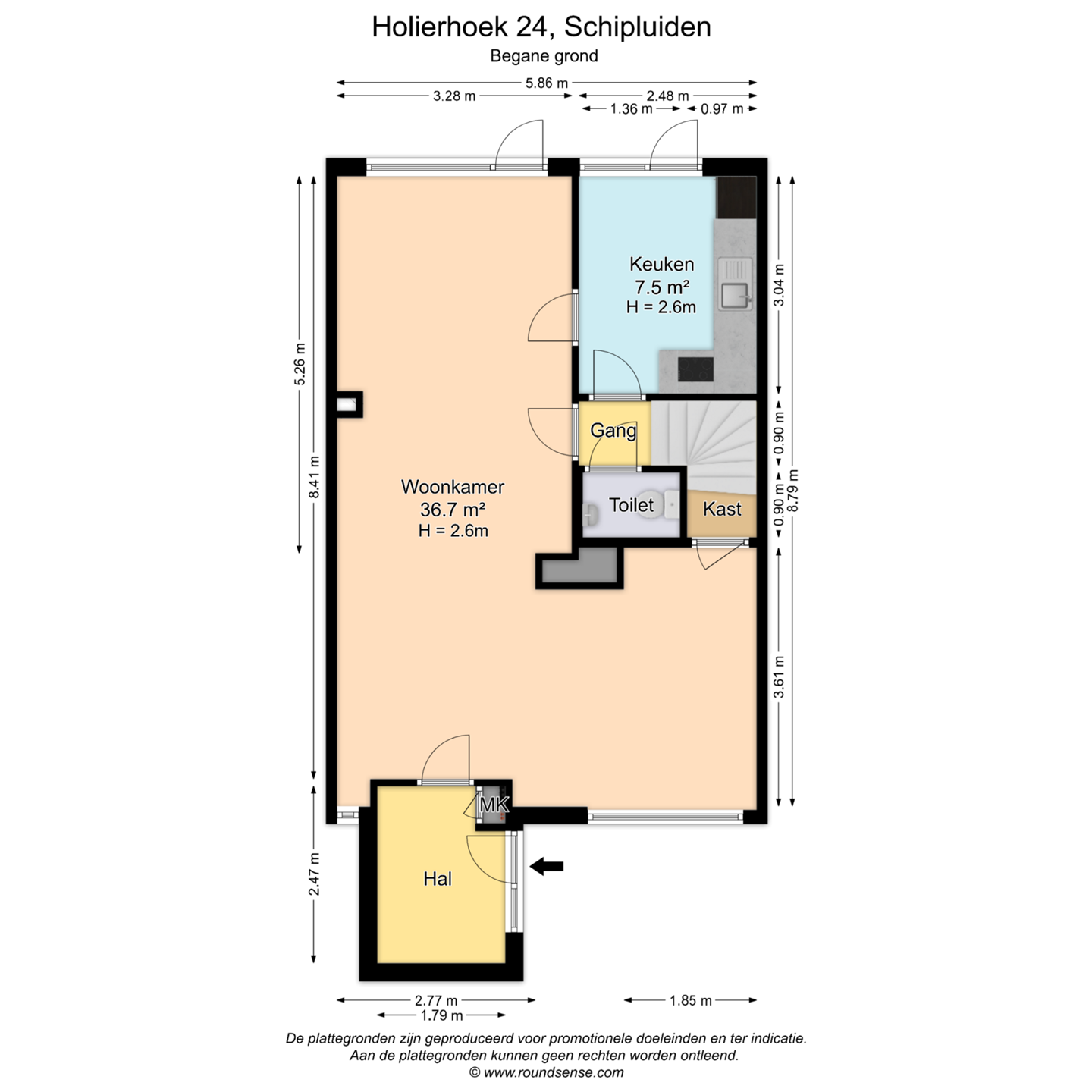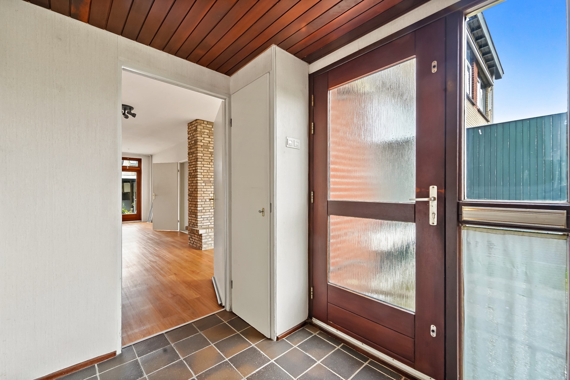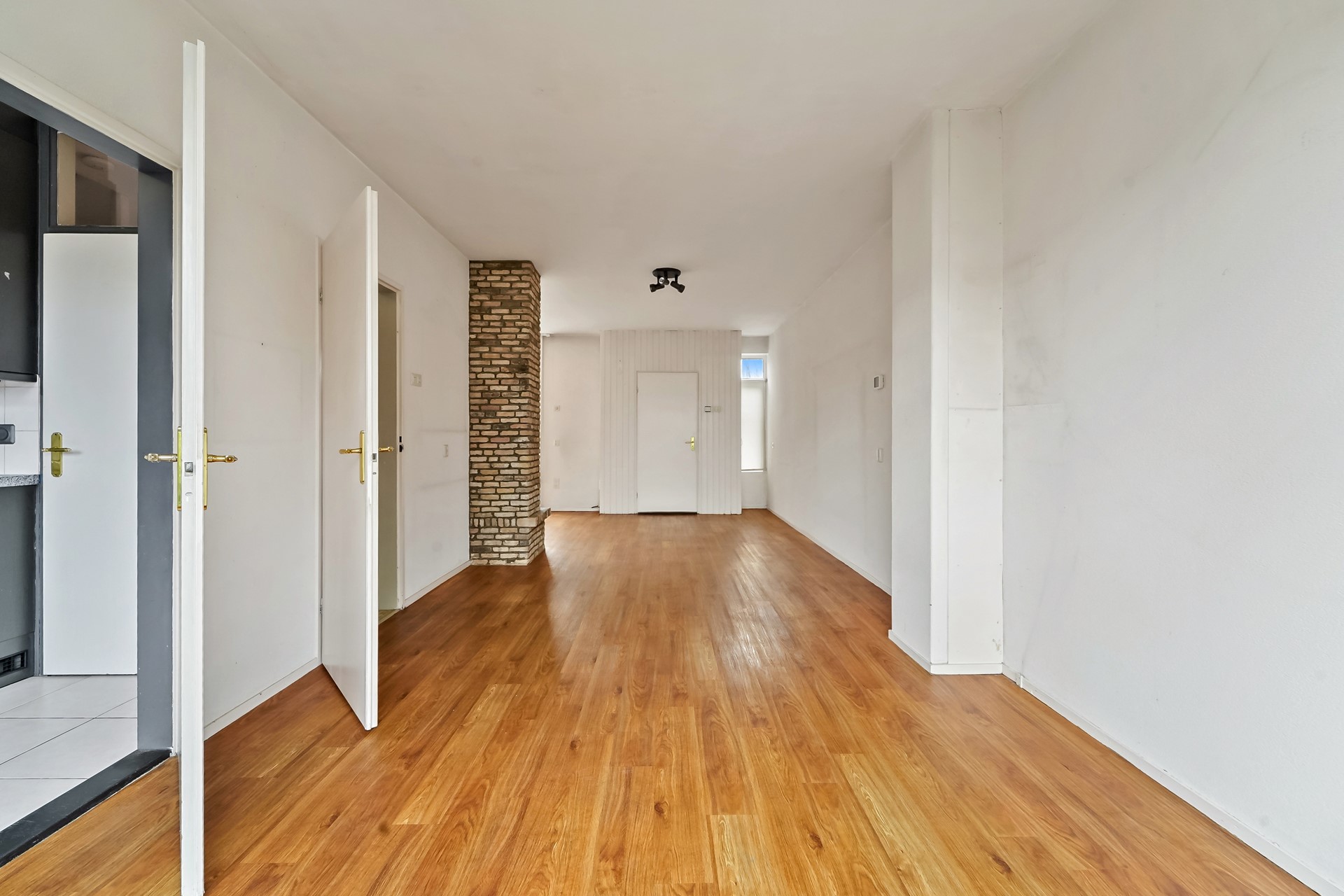 Entree naar hal. Toegang tot de woonkamer met aan de achterzijde gelegen keuken.