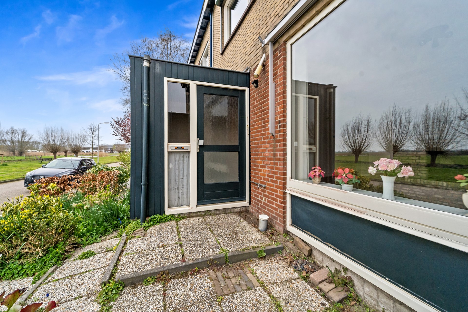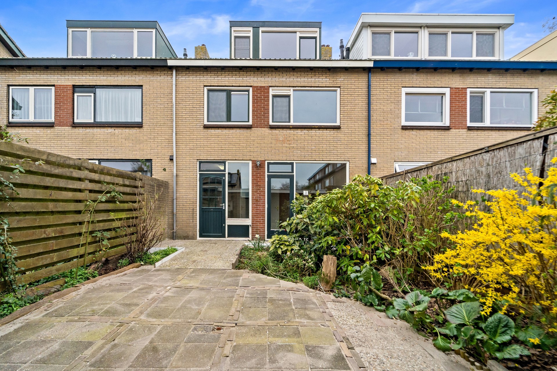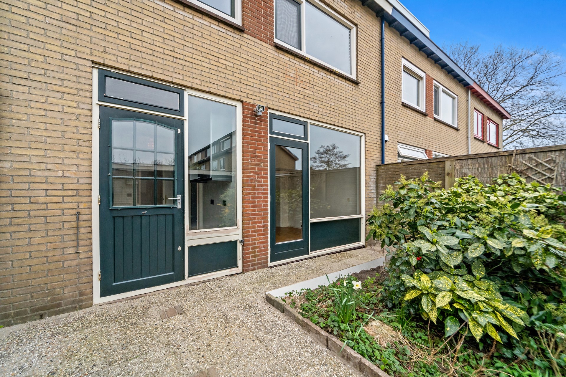 Voortuin op het zuiden met groenborders.