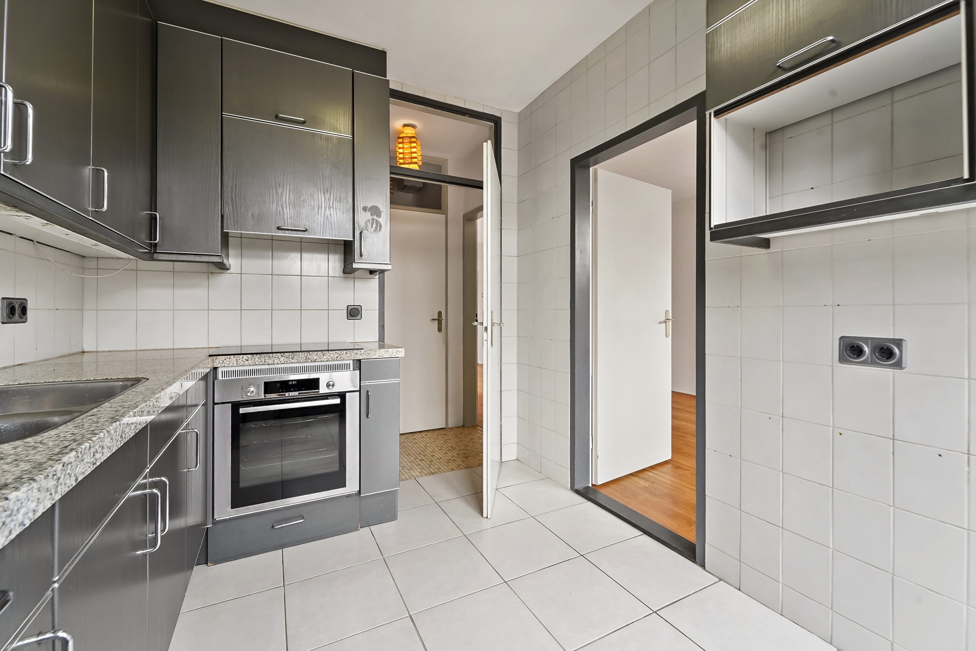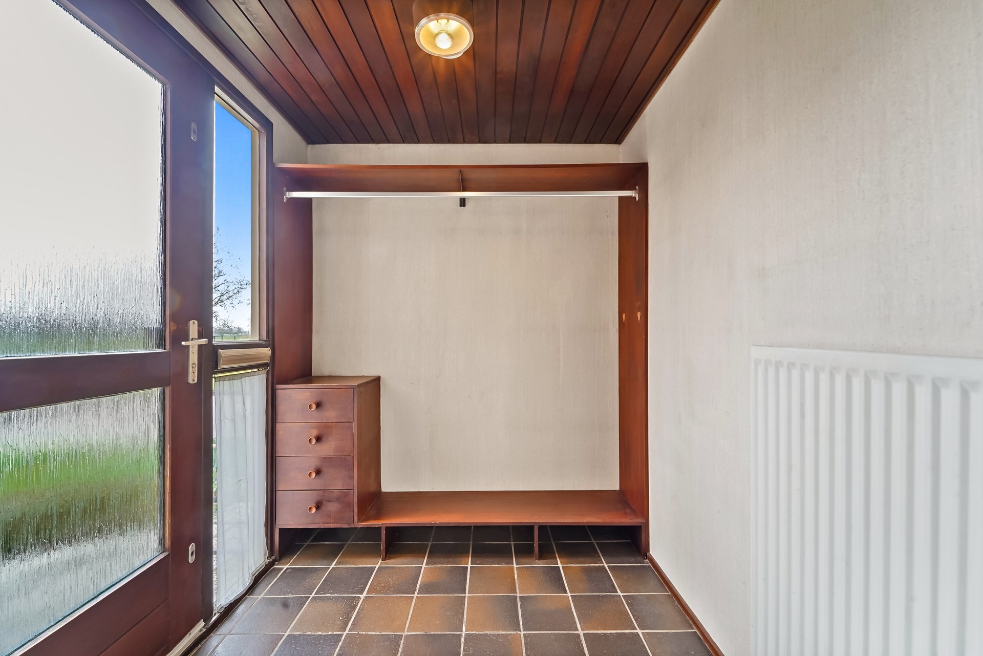 • Dichte keuken voorzien van 4-pits inductiekookplaat met afzuigkap, oven, spoelbak met mengkraan, close-in boiler, koelkast, vriezer en een deur naar de tuin.