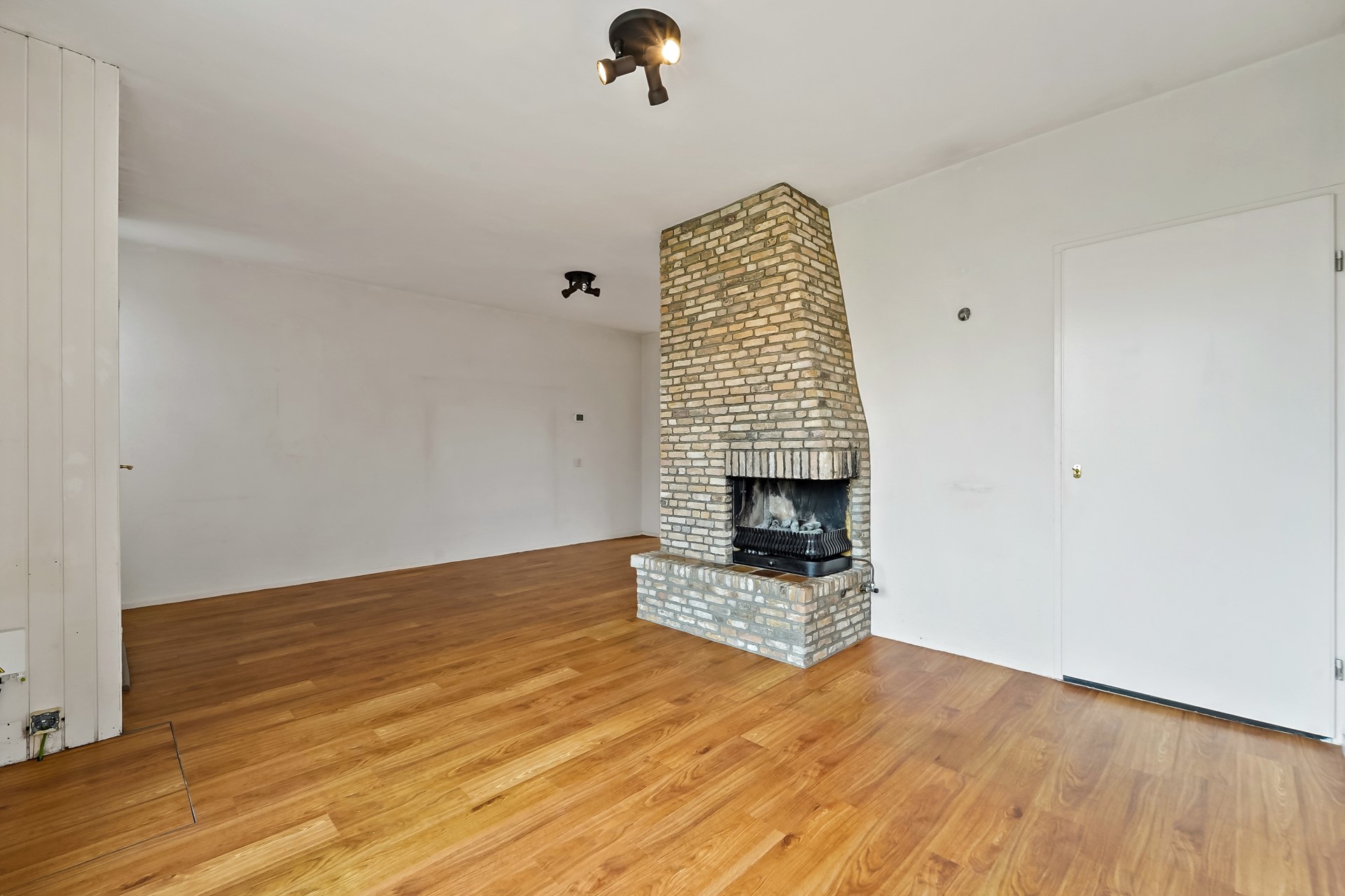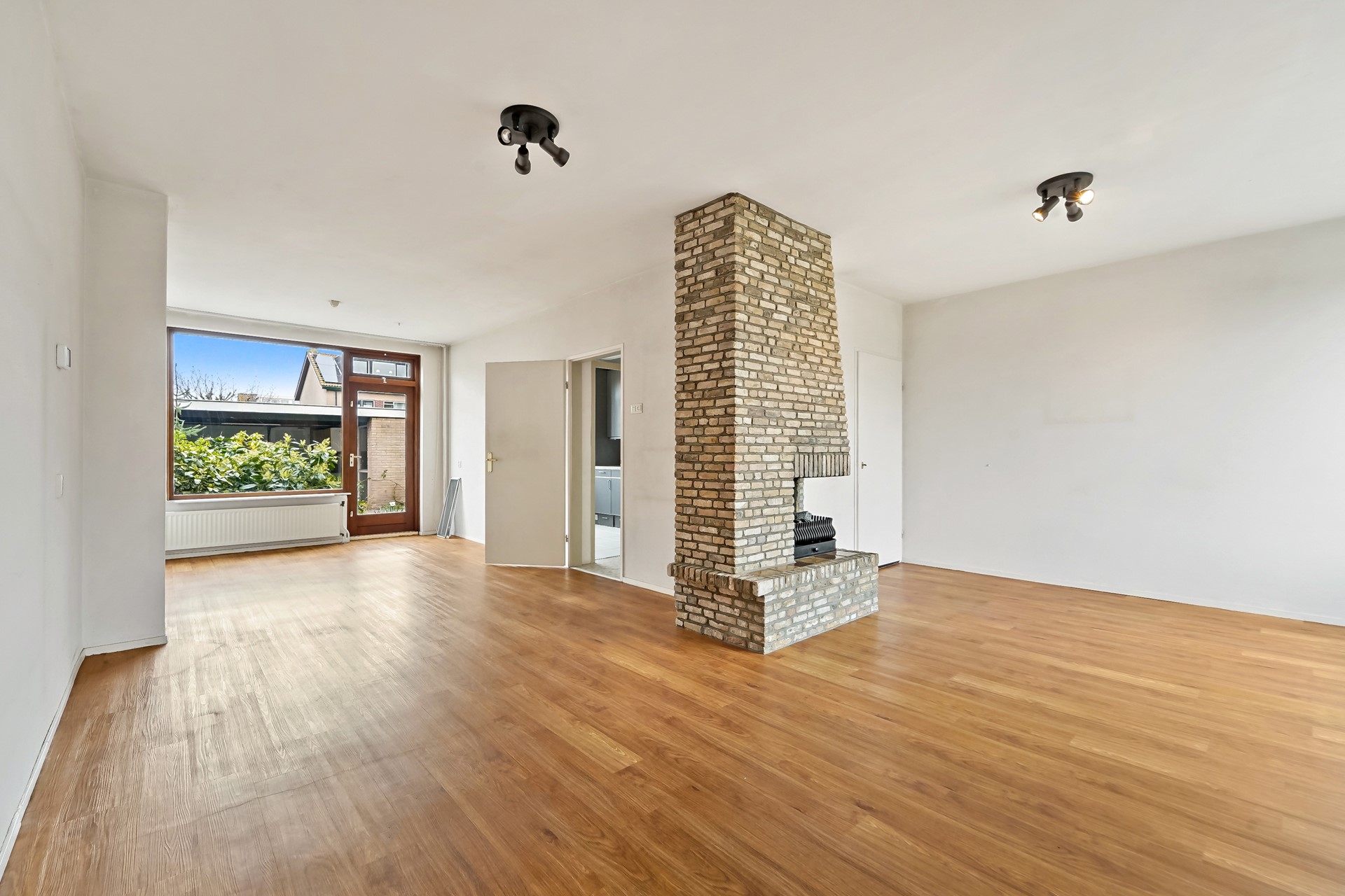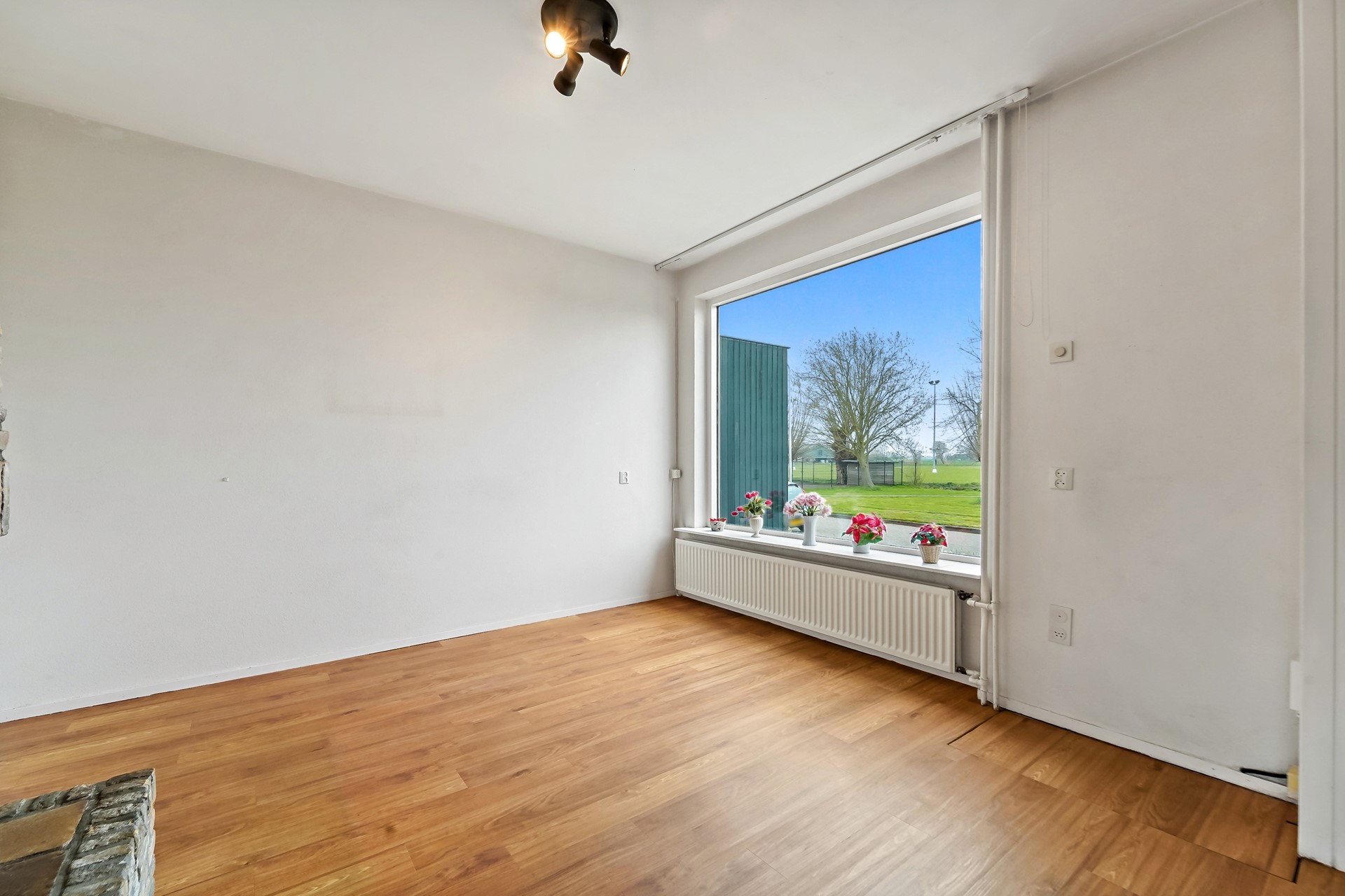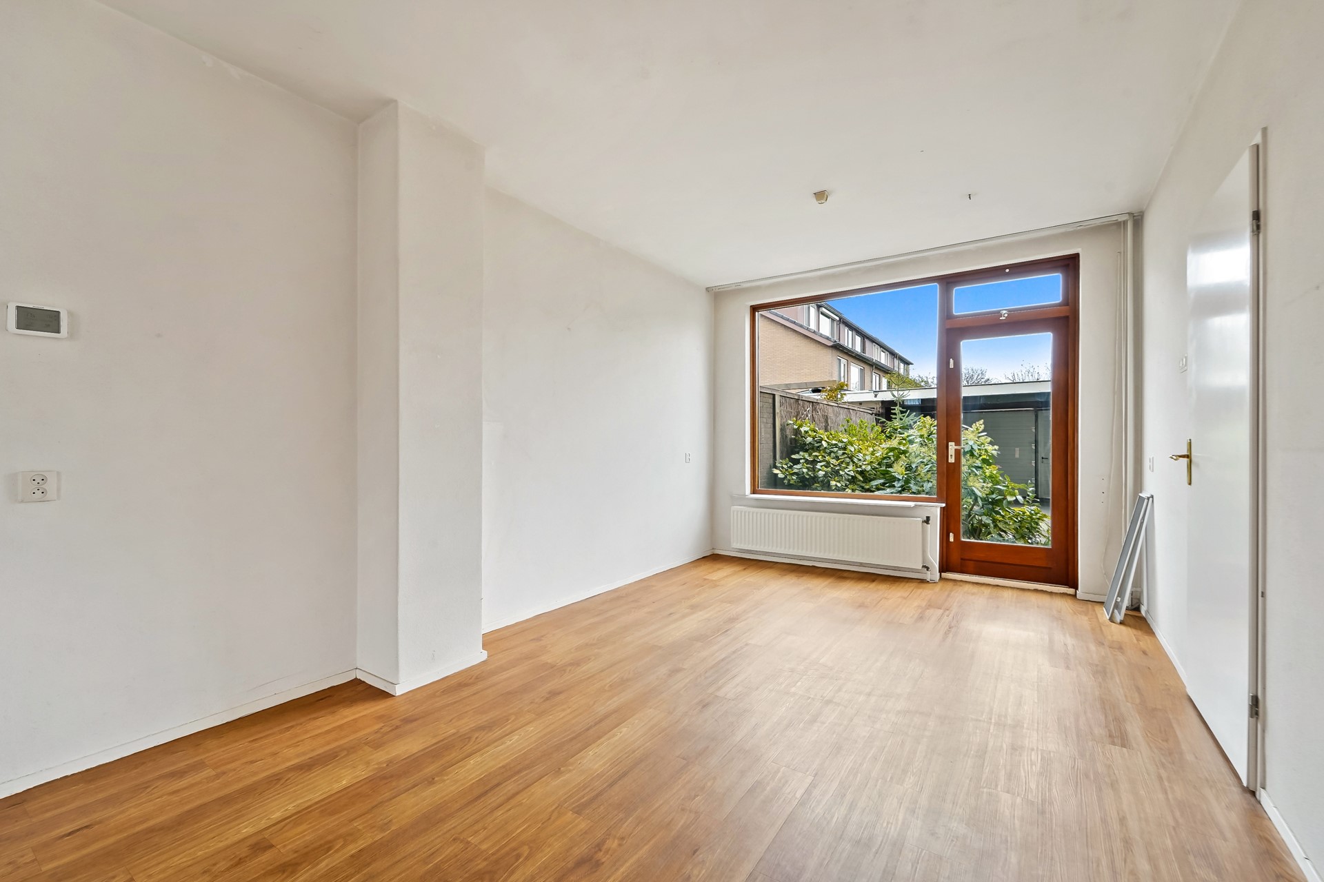 • Royale woonkamer met mooi vrij uitzicht aan de voorzijde, voorzien van een PVC vloer, trapkast, elektrisch zonnescherm aan de voorzijde en aan de achterzijde een deur naar de tuin.