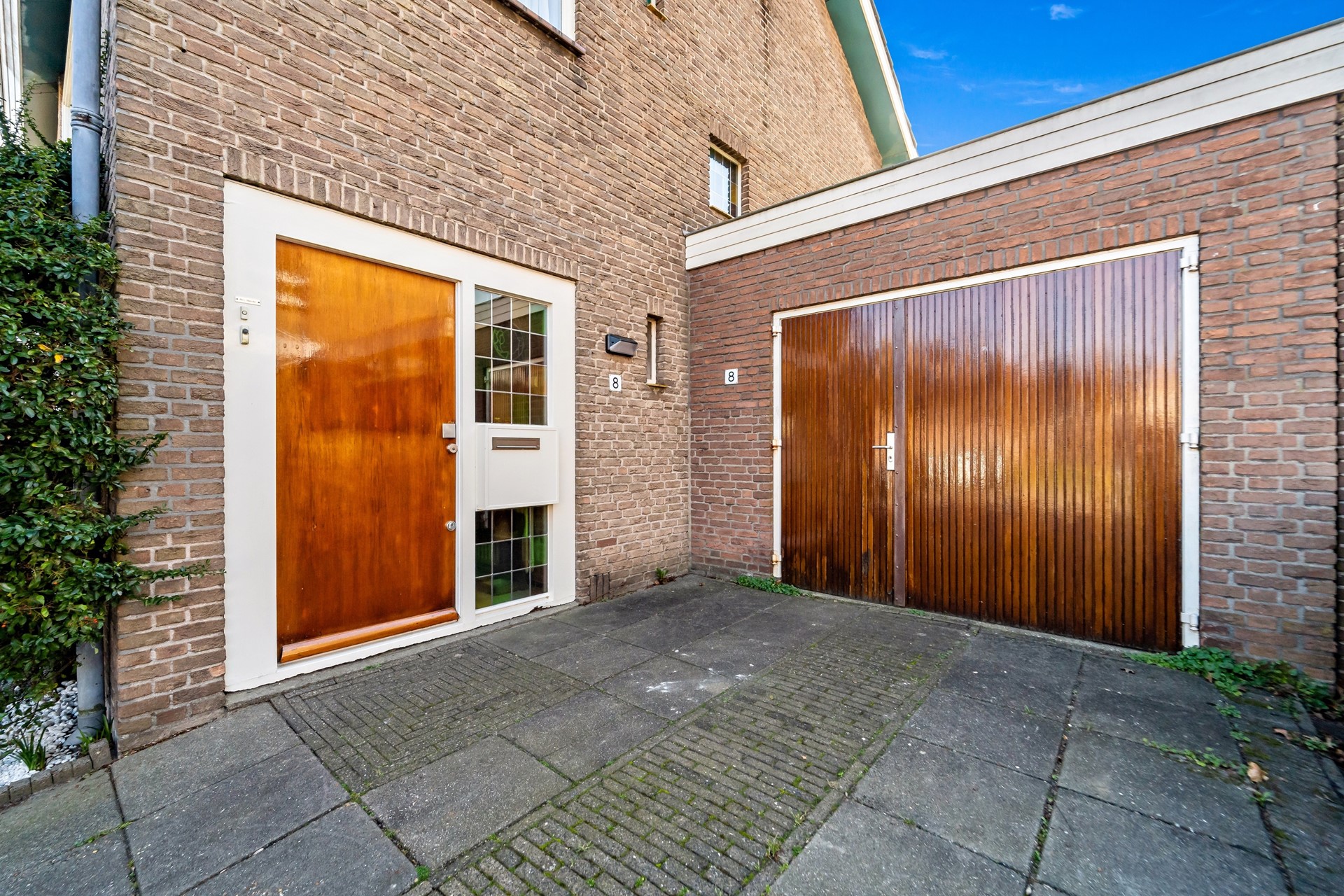 Voortuin met beplanting en parkeren op eigen terrein.