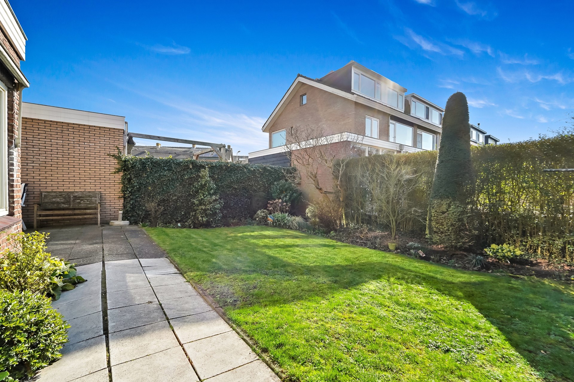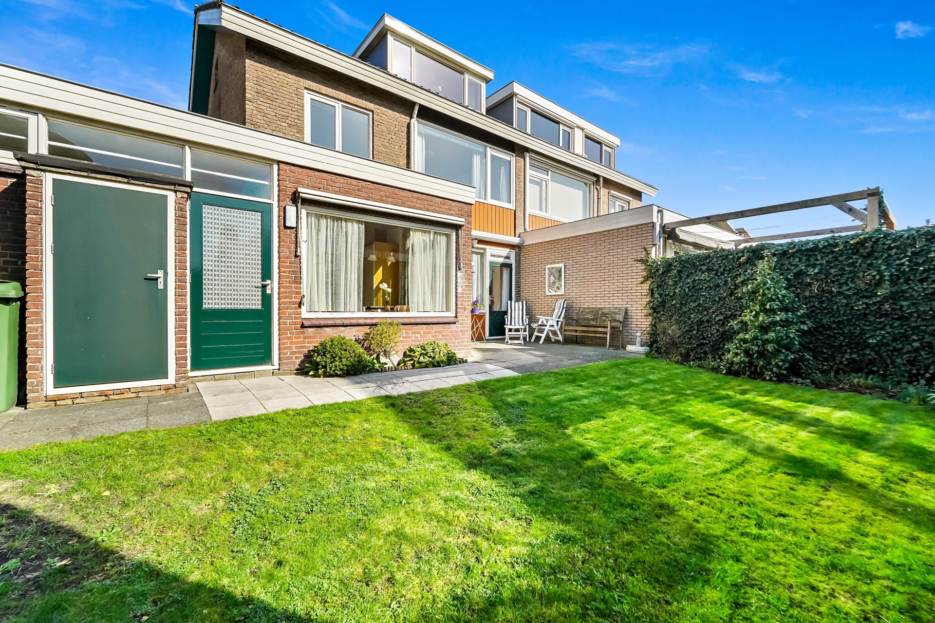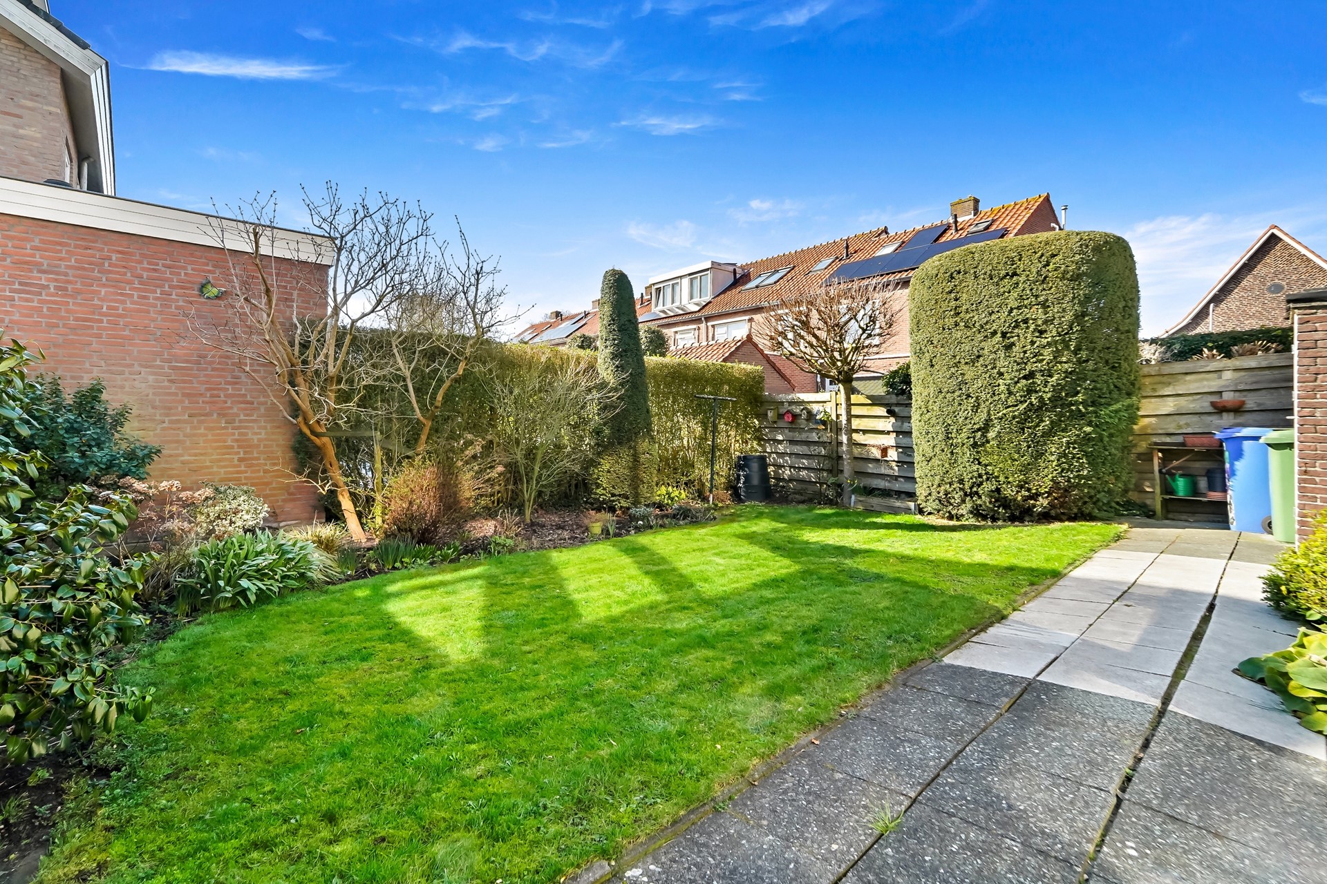 De heerlijk brede achtertuin ligt op het zuid-westen en is voorzien van terras, groenborders, gazon en een kleine berging (voormalig kolenhok).