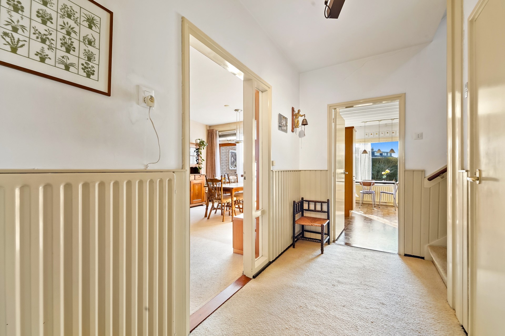 Vestibule met meterkast, doorloop naar gang met toilet, trapopgang, kelderkast, woonkamer en keuken. Aan de achterzijde gelegen gesloten keuken met toegang tot achtertuin en de aangebouwde garage.