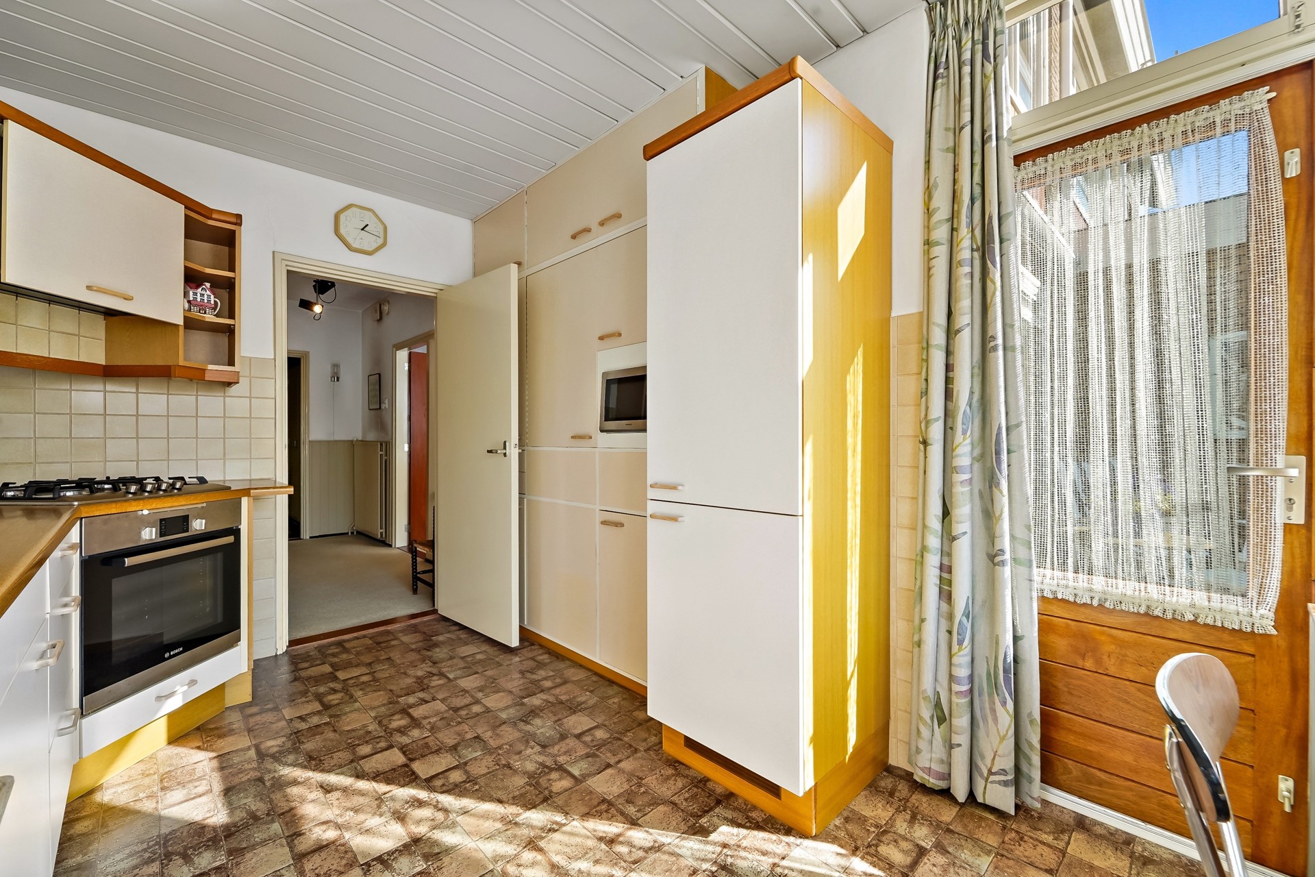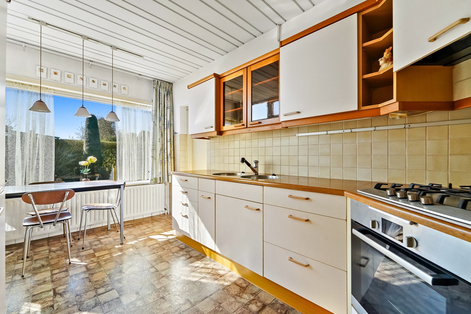 • Royale gesloten keuken voorzien van kastjes, lades, 4-pits gaskookplaat met afzuigkap, oven, magnetron, dubbele spoelbak met mengkraan, koelkast, vriezer, toegang tot de achtertuin en de garage. Er is hier zélfs voldoende ruimte voor een ontbijttafel.