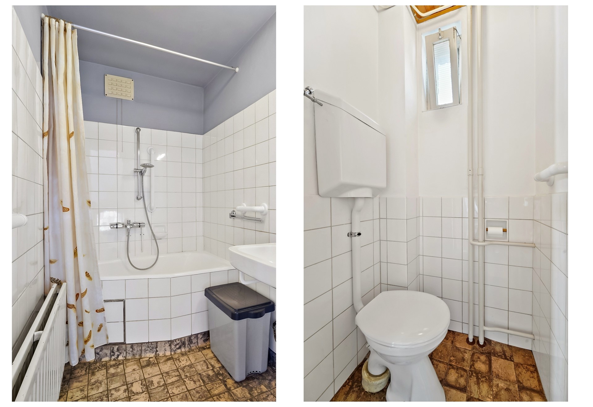 • De badkamer is vrijwel volledig betegeld, voorzien van een bad met douche en wastafel.